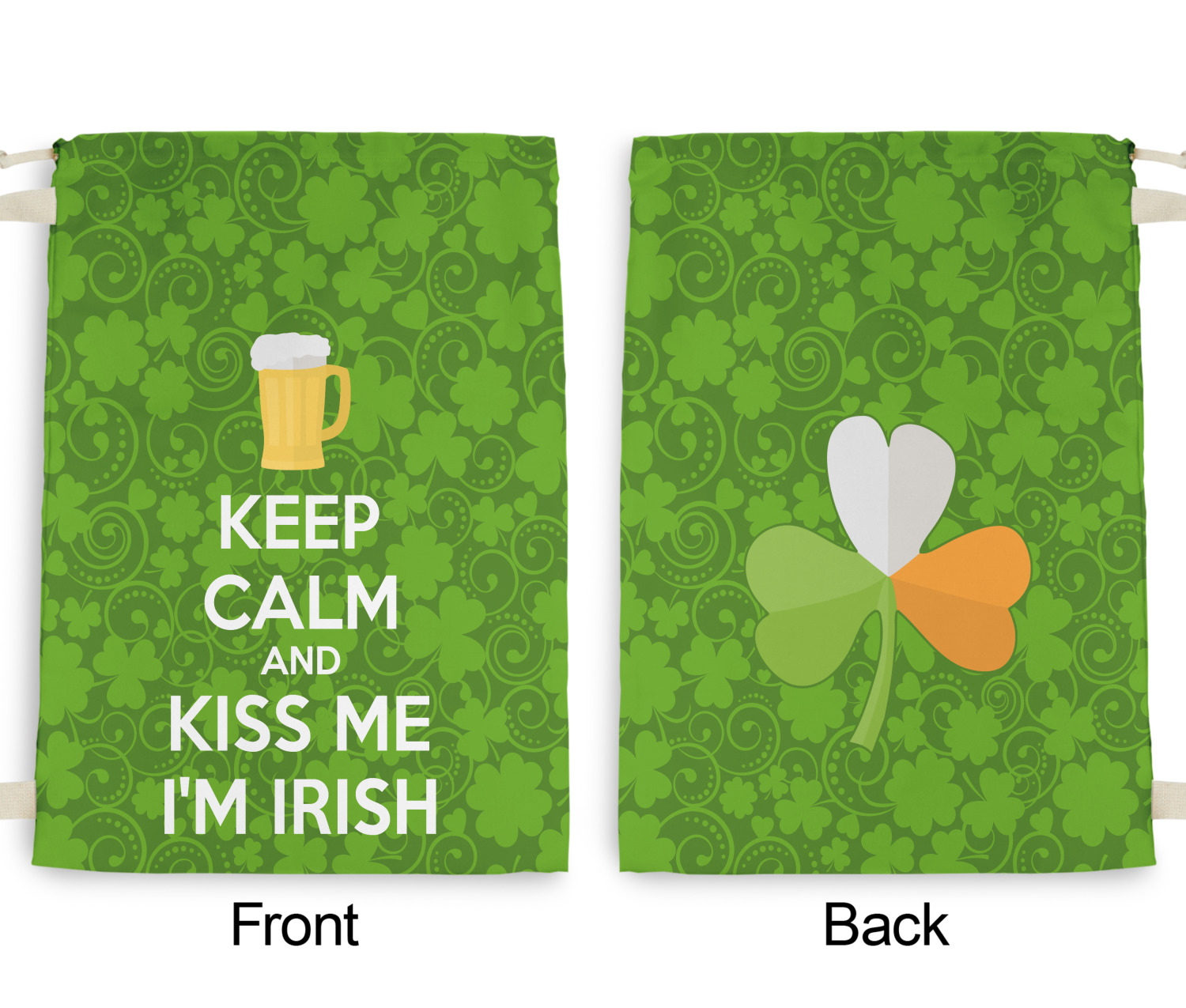 This lucky design is mostly bright green. The background has a lighter green and a darker green making up a background of clovers and swirls. The foreground is a fun phrase that says "Keep calm and kiss me I'm Irish." A fun beer graphic sits above this. You can easily personalize this phrase as well as the graphic above to be whatever you like.