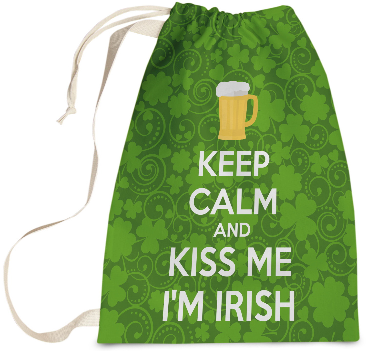 This lucky design is mostly bright green. The background has a lighter green and a darker green making up a background of clovers and swirls. The foreground is a fun phrase that says "Keep calm and kiss me I'm Irish." A fun beer graphic sits above this. You can easily personalize this phrase as well as the graphic above to be whatever you like.