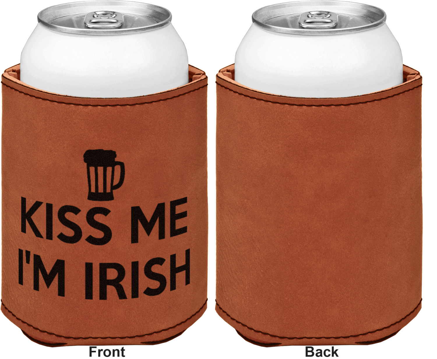 This can sleeve is made from a cognac-brown leatherette and stitched with a sturdy, black thread. A slim padding lines the inside of your can sleeve to allow for a better fit once your drink is inserted. The sleeve itself measures at 4 by 4.5 inches, allowing this custom can sleeve to accommodate most canned drinks. Your personalized design can be engraved on the front and back, or solely the front. When laser-engraved, your design appears as a black coloration which contrasts the leatherette nicely.
