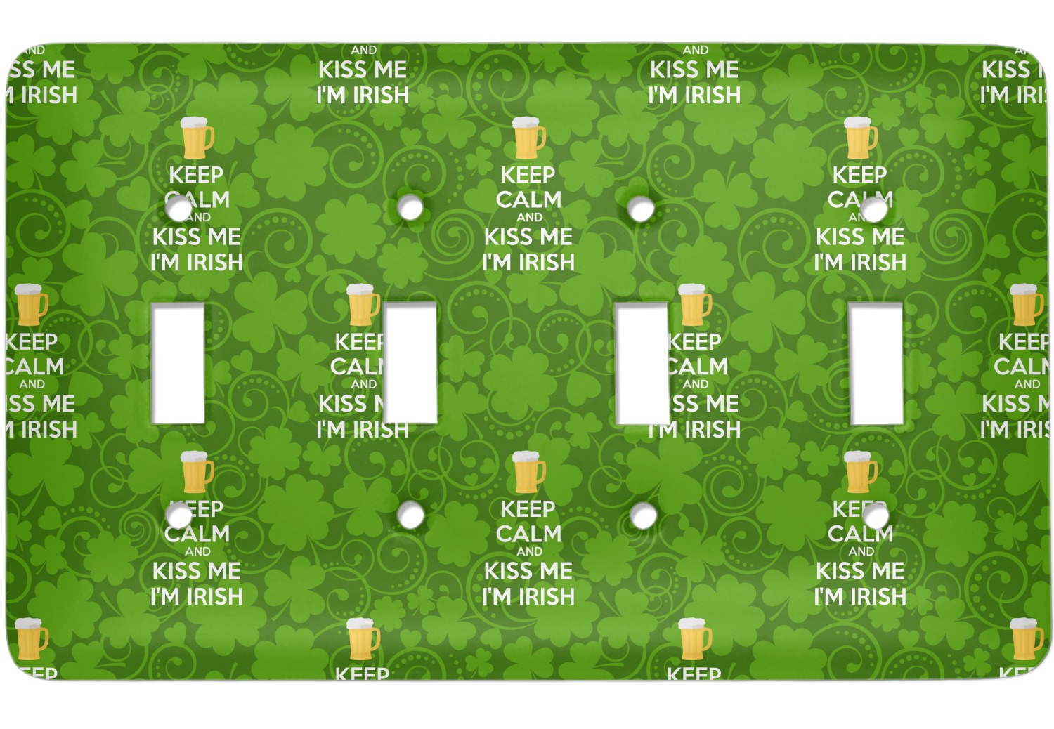 This lucky design is mostly bright green. The background has a lighter green and a darker green making up a background of clovers and swirls. The foreground is a fun phrase that says "Keep calm and kiss me I'm Irish." A fun beer graphic sits above this. You can easily personalize this phrase as well as the graphic above to be whatever you like.