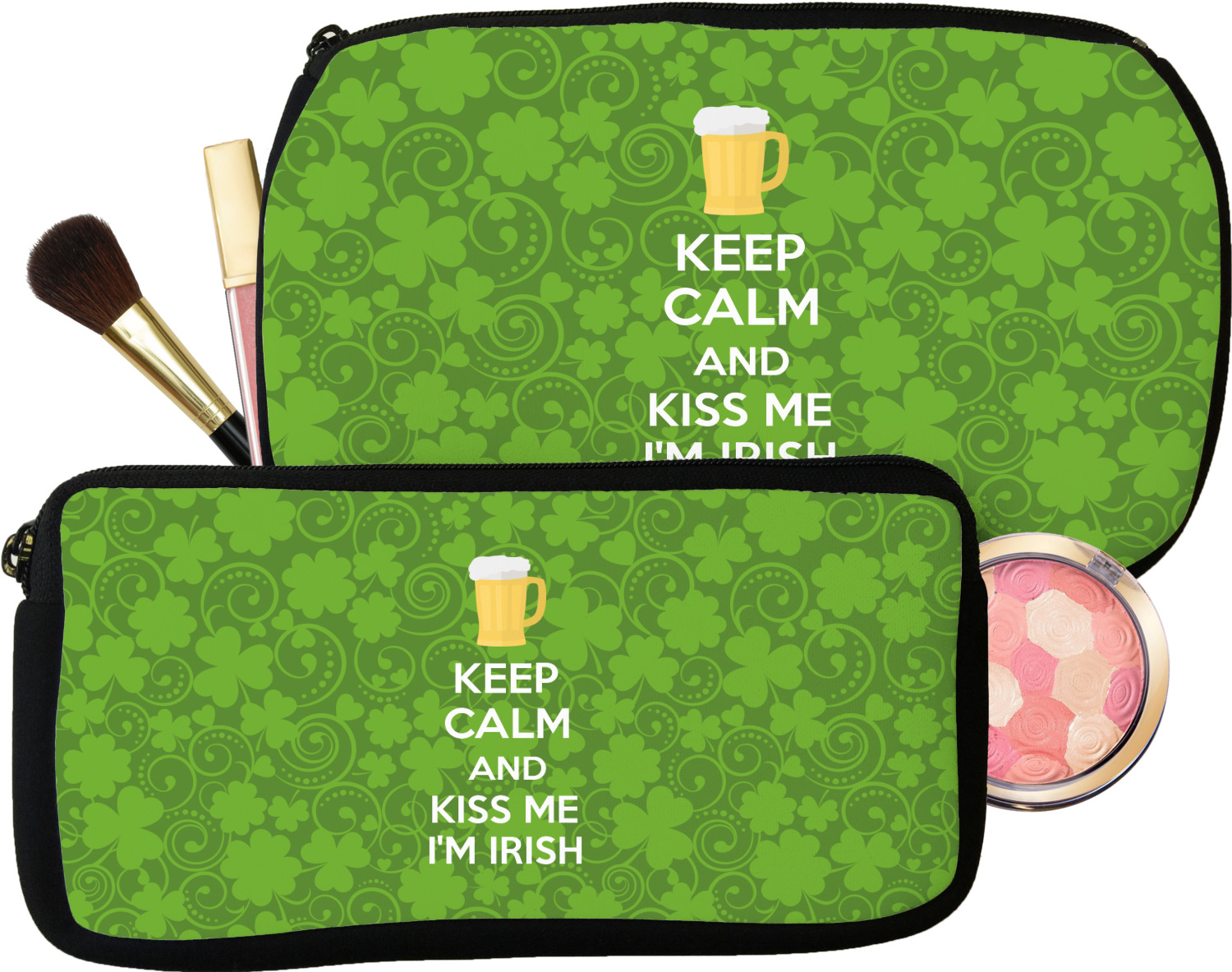 This lucky design is mostly bright green. The background has a lighter green and a darker green making up a background of clovers and swirls. The foreground is a fun phrase that says "Keep calm and kiss me I'm Irish." A fun beer graphic sits above this. You can easily personalize this phrase as well as the graphic above to be whatever you like.