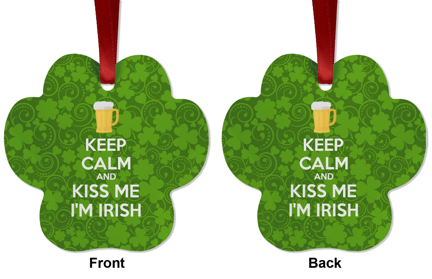 This lucky design is mostly bright green. The background has a lighter green and a darker green making up a background of clovers and swirls. The foreground is a fun phrase that says "Keep calm and kiss me I'm Irish." A fun beer graphic sits above this. You can easily personalize this phrase as well as the graphic above to be whatever you like.