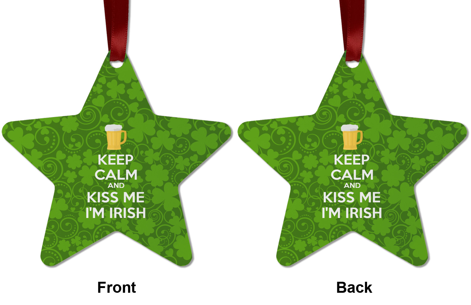 This lucky design is mostly bright green. The background has a lighter green and a darker green making up a background of clovers and swirls. The foreground is a fun phrase that says "Keep calm and kiss me I'm Irish." A fun beer graphic sits above this. You can easily personalize this phrase as well as the graphic above to be whatever you like.