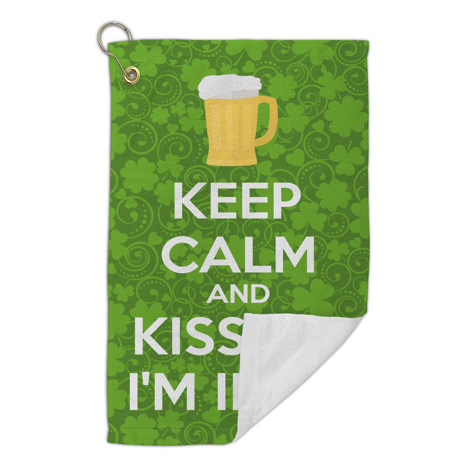 This lucky design is mostly bright green. The background has a lighter green and a darker green making up a background of clovers and swirls. The foreground is a fun phrase that says "Keep calm and kiss me I'm Irish." A fun beer graphic sits above this. You can easily personalize this phrase as well as the graphic above to be whatever you like.