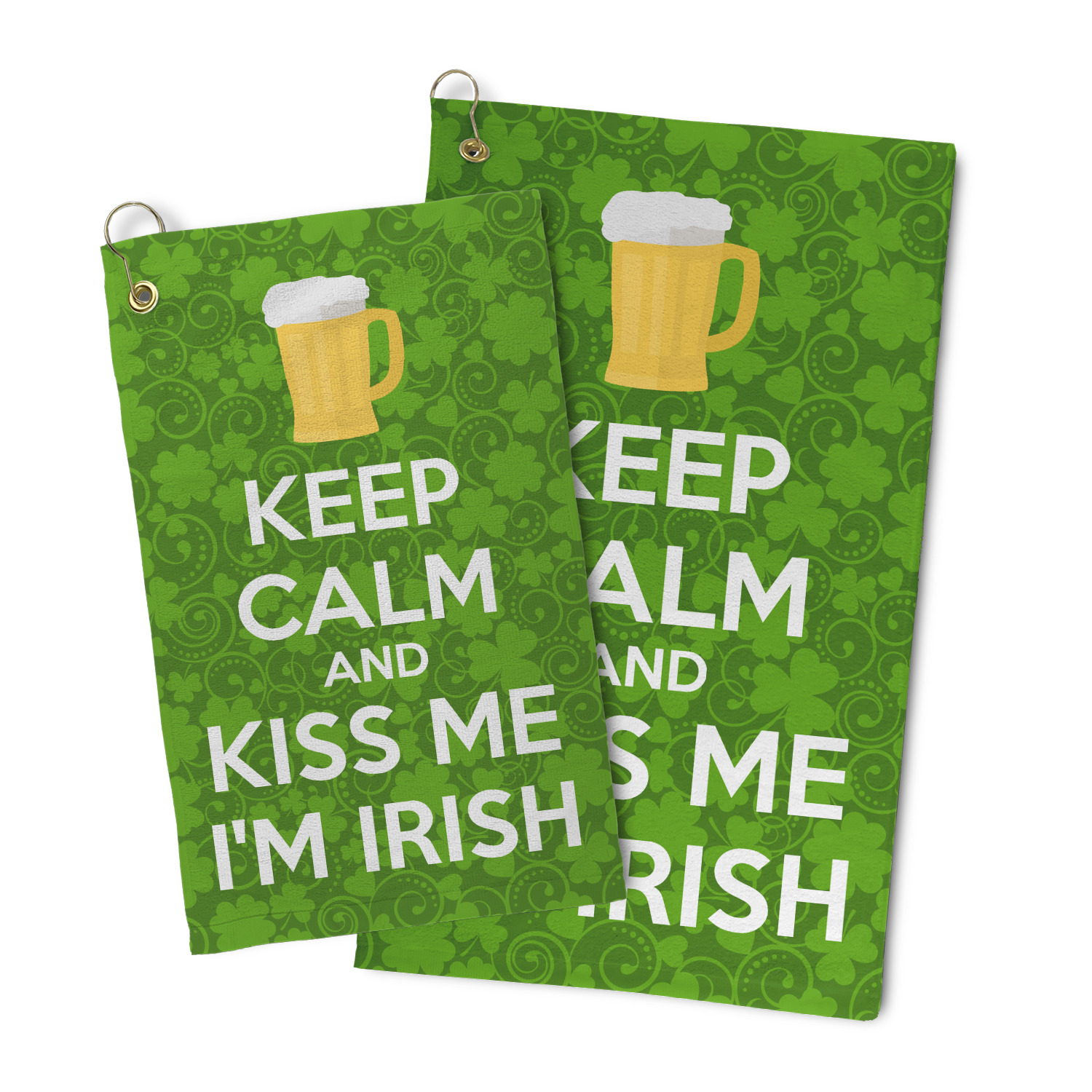 This lucky design is mostly bright green. The background has a lighter green and a darker green making up a background of clovers and swirls. The foreground is a fun phrase that says "Keep calm and kiss me I'm Irish." A fun beer graphic sits above this. You can easily personalize this phrase as well as the graphic above to be whatever you like.