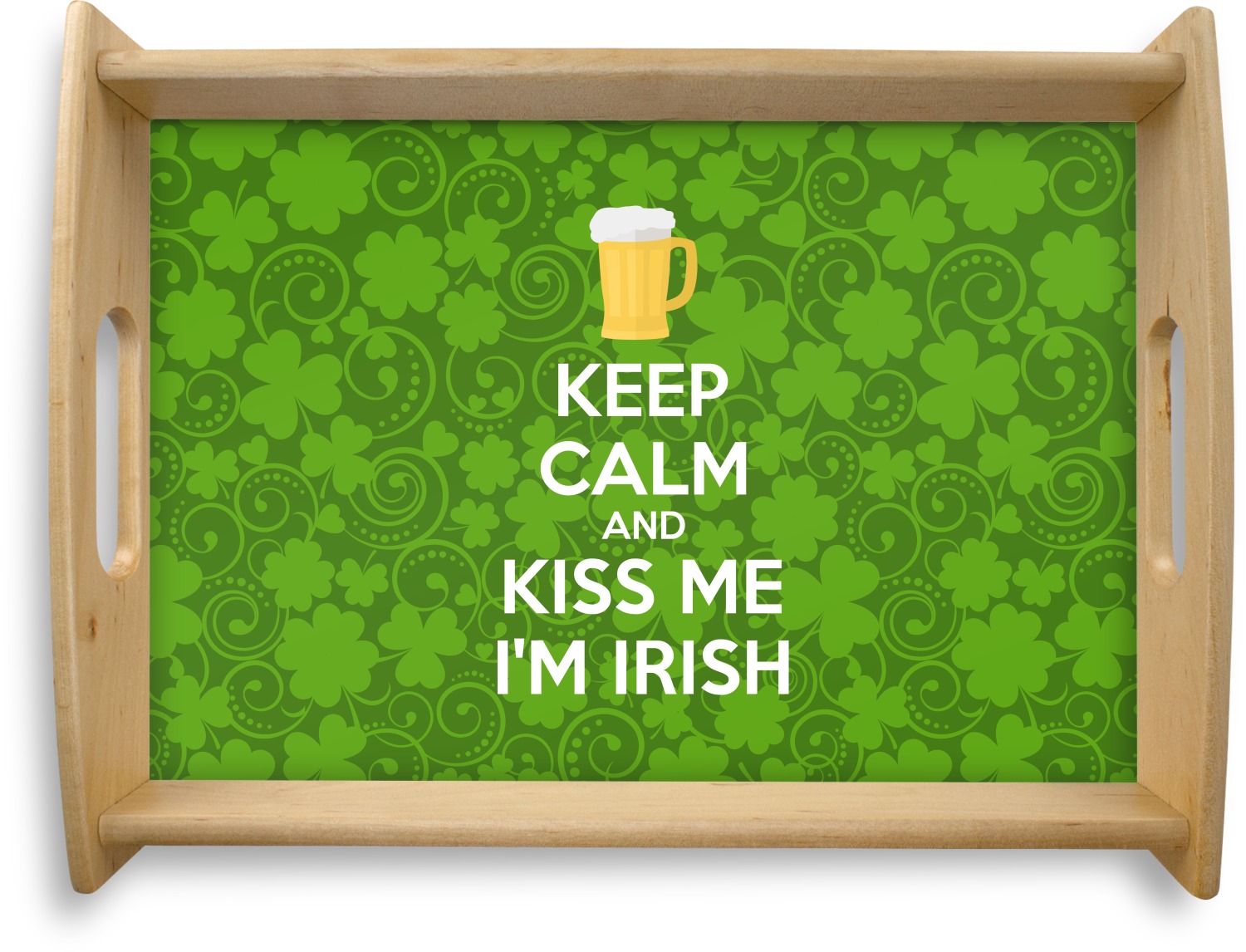 This lucky design is mostly bright green. The background has a lighter green and a darker green making up a background of clovers and swirls. The foreground is a fun phrase that says "Keep calm and kiss me I'm Irish." A fun beer graphic sits above this. You can easily personalize this phrase as well as the graphic above to be whatever you like.