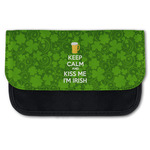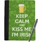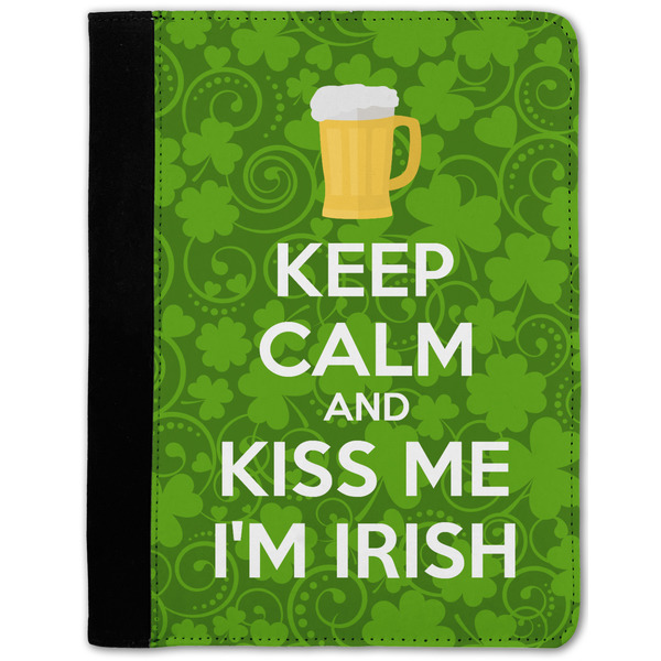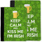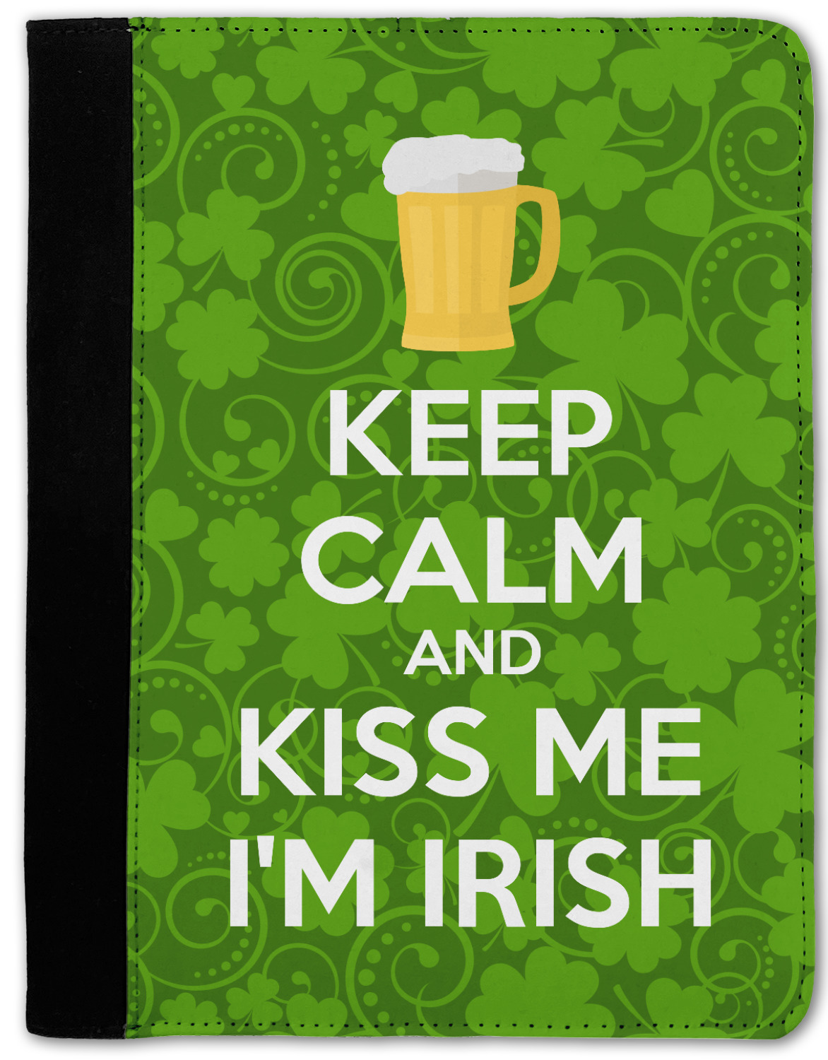 This lucky design is mostly bright green. The background has a lighter green and a darker green making up a background of clovers and swirls. The foreground is a fun phrase that says "Keep calm and kiss me I'm Irish." A fun beer graphic sits above this. You can easily personalize this phrase as well as the graphic above to be whatever you like.