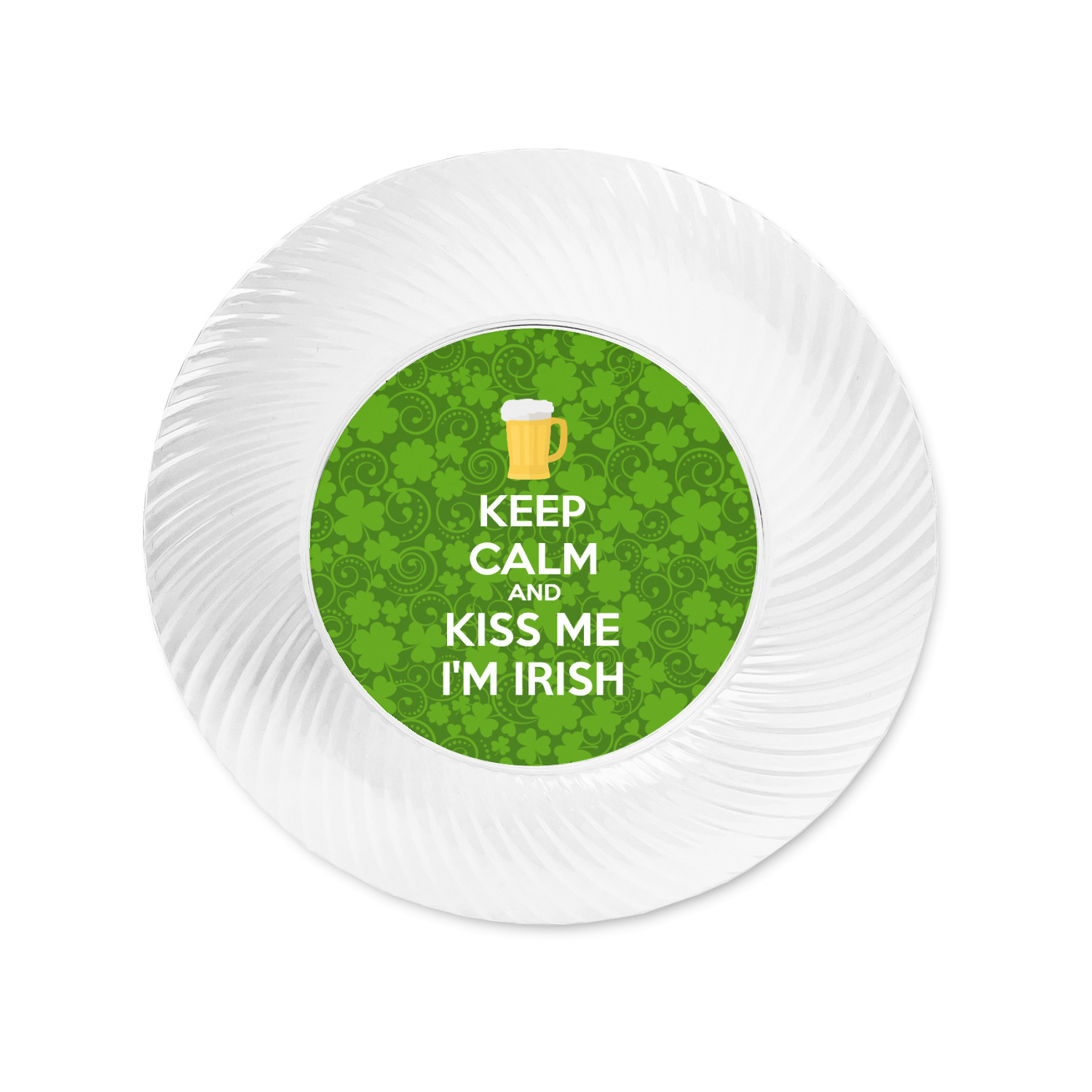 This lucky design is mostly bright green. The background has a lighter green and a darker green making up a background of clovers and swirls. The foreground is a fun phrase that says "Keep calm and kiss me I'm Irish." A fun beer graphic sits above this. You can easily personalize this phrase as well as the graphic above to be whatever you like.