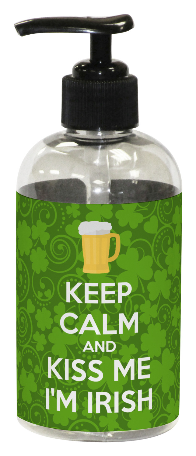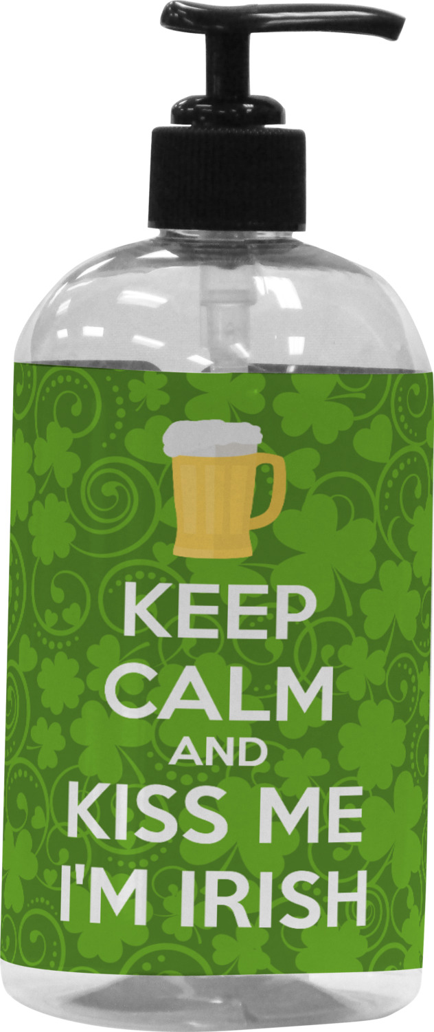 This lucky design is mostly bright green. The background has a lighter green and a darker green making up a background of clovers and swirls. The foreground is a fun phrase that says "Keep calm and kiss me I'm Irish." A fun beer graphic sits above this. You can easily personalize this phrase as well as the graphic above to be whatever you like.