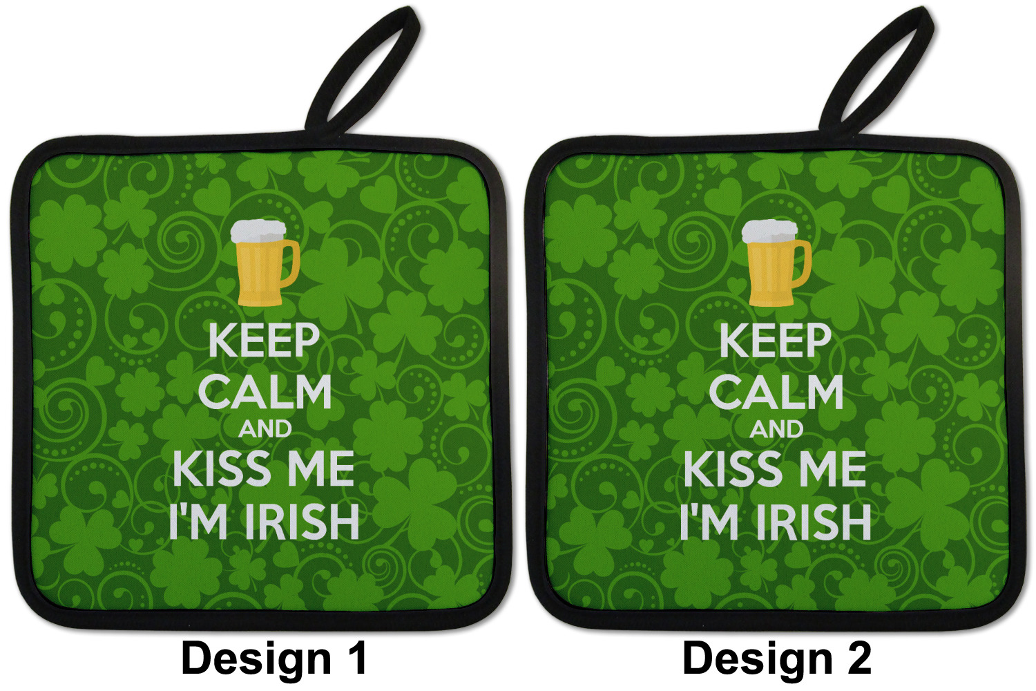 This lucky design is mostly bright green. The background has a lighter green and a darker green making up a background of clovers and swirls. The foreground is a fun phrase that says "Keep calm and kiss me I'm Irish." A fun beer graphic sits above this. You can easily personalize this phrase as well as the graphic above to be whatever you like.