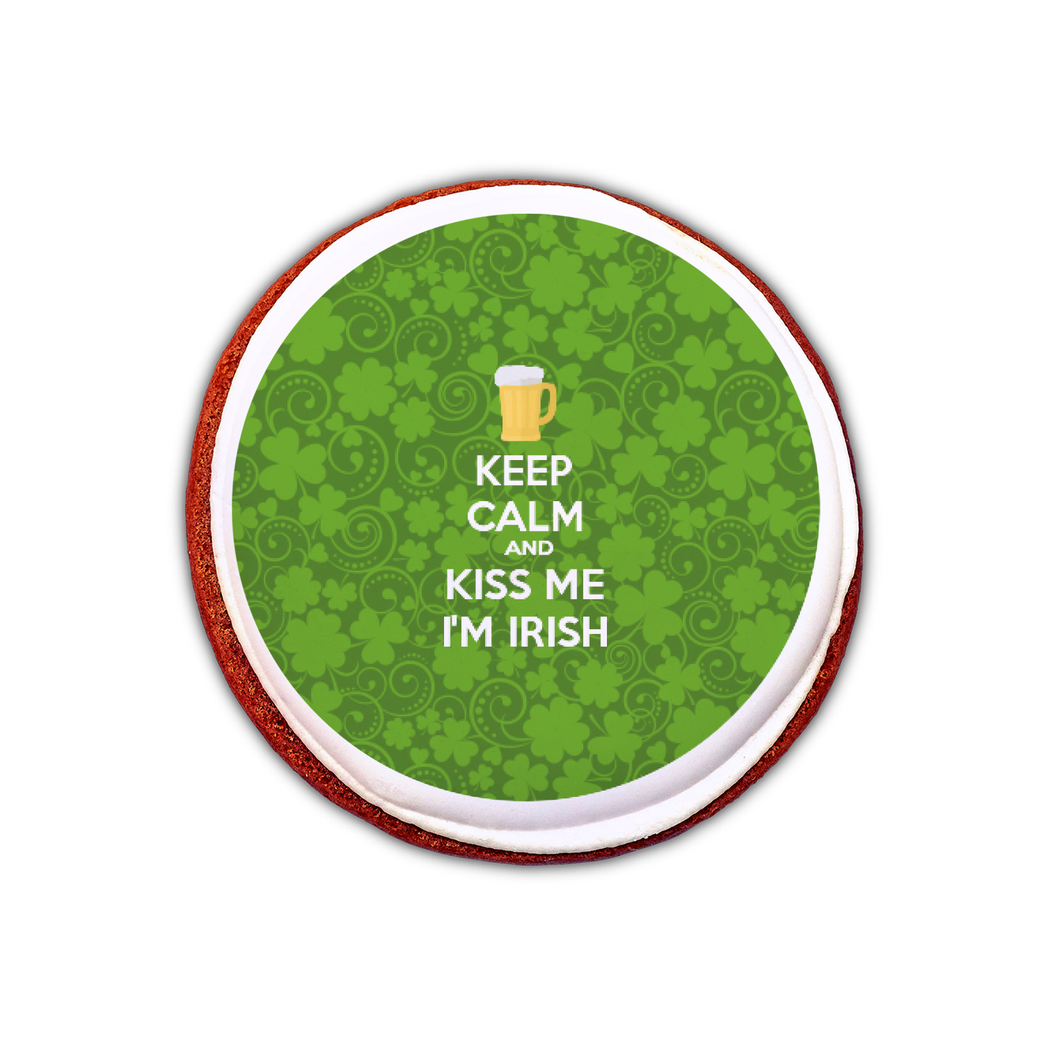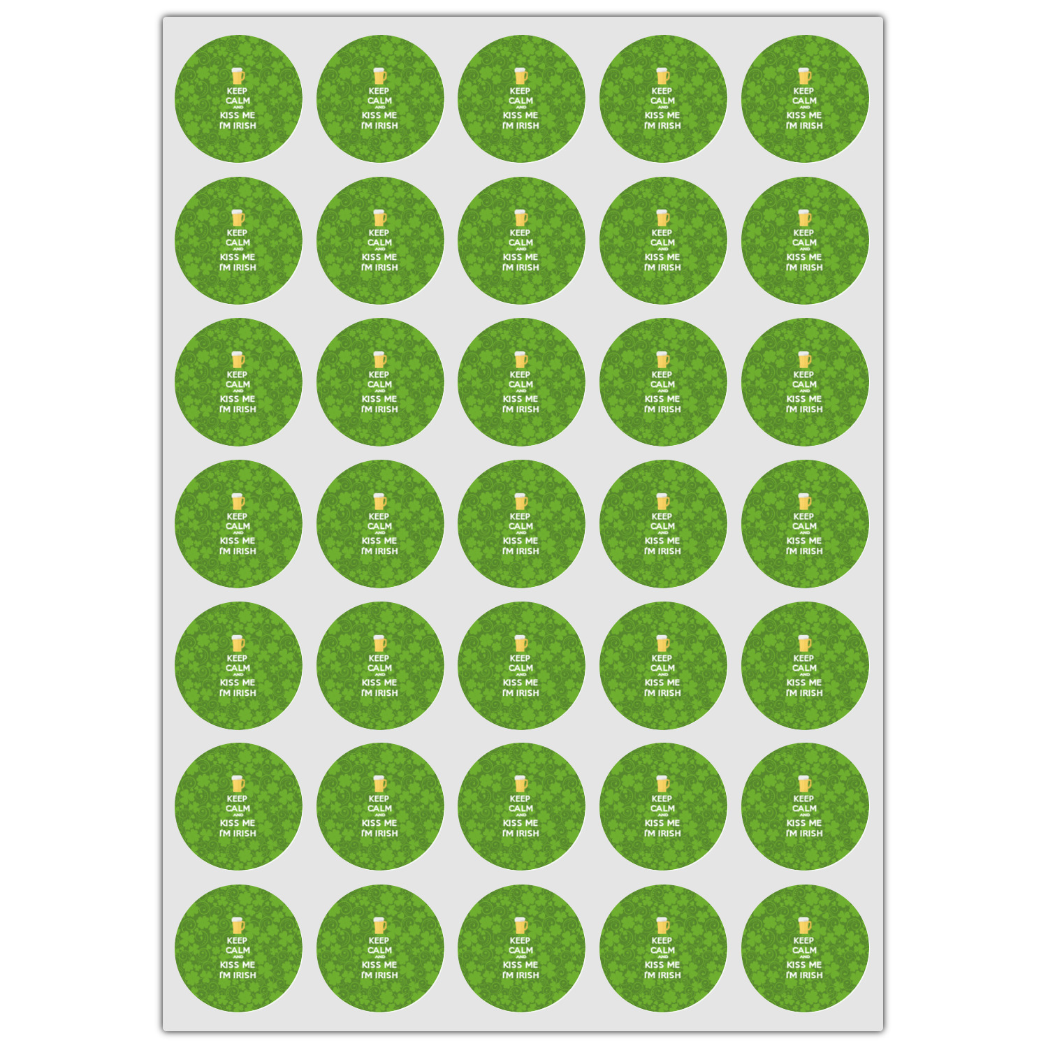 This lucky design is mostly bright green. The background has a lighter green and a darker green making up a background of clovers and swirls. The foreground is a fun phrase that says "Keep calm and kiss me I'm Irish." A fun beer graphic sits above this. You can easily personalize this phrase as well as the graphic above to be whatever you like.