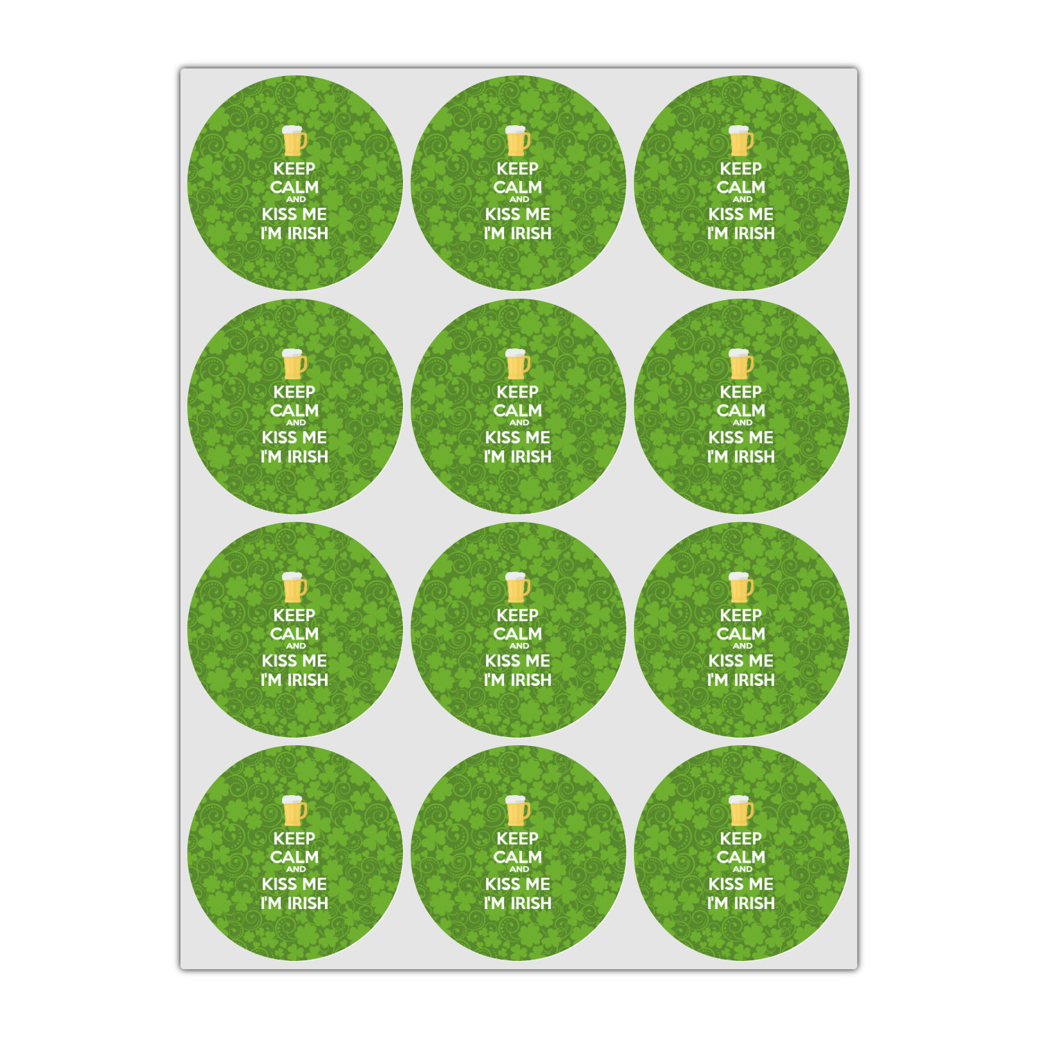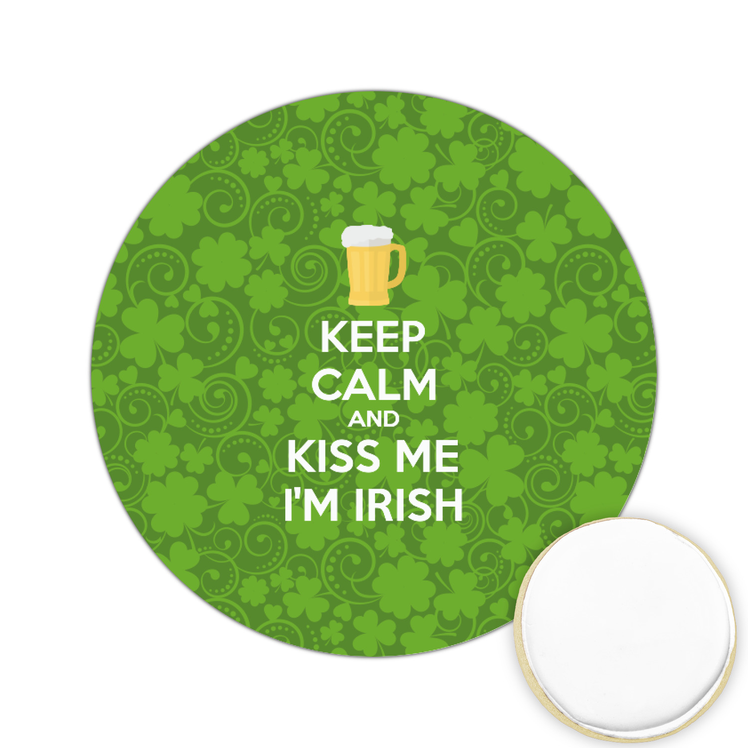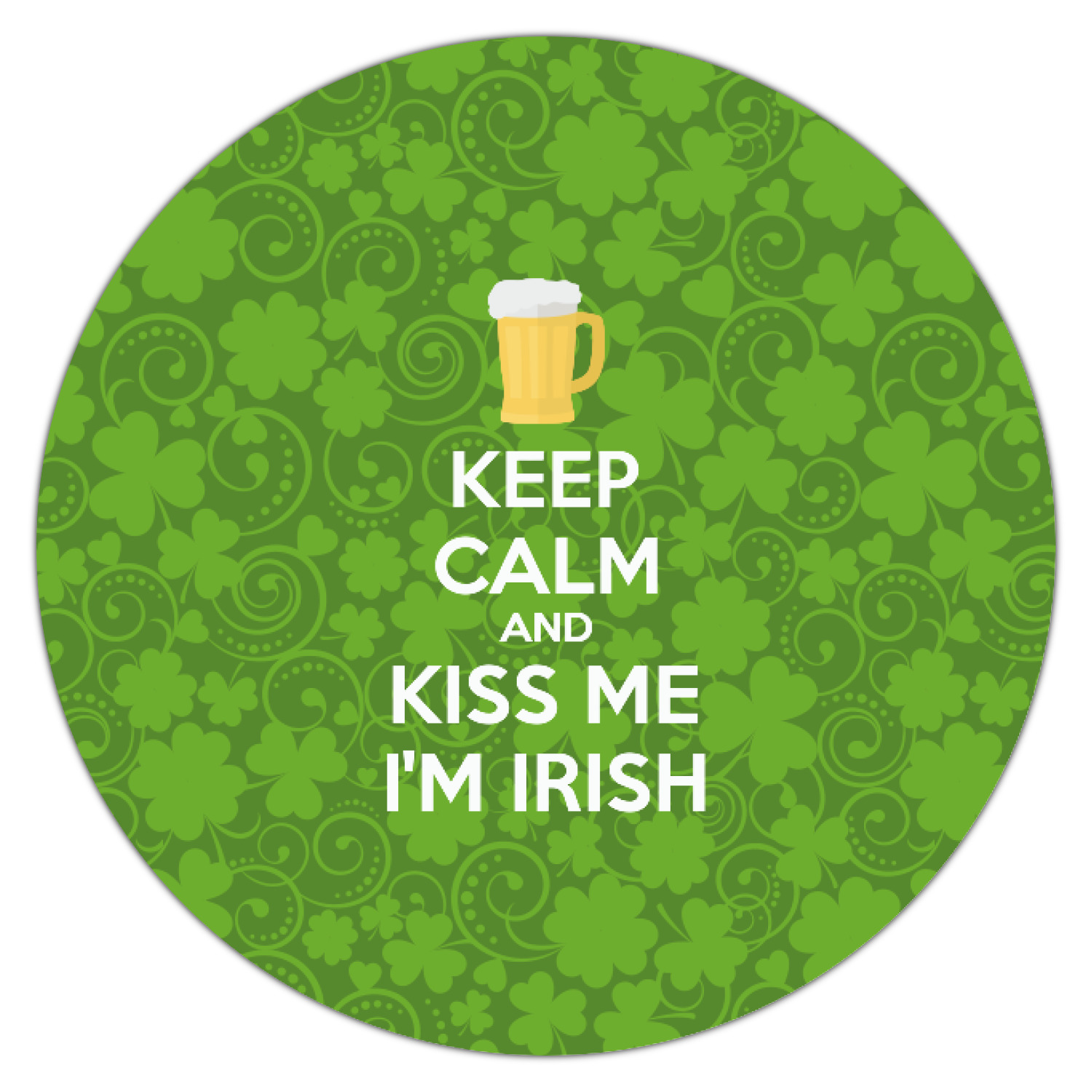 This lucky design is mostly bright green. The background has a lighter green and a darker green making up a background of clovers and swirls. The foreground is a fun phrase that says "Keep calm and kiss me I'm Irish." A fun beer graphic sits above this. You can easily personalize this phrase as well as the graphic above to be whatever you like.