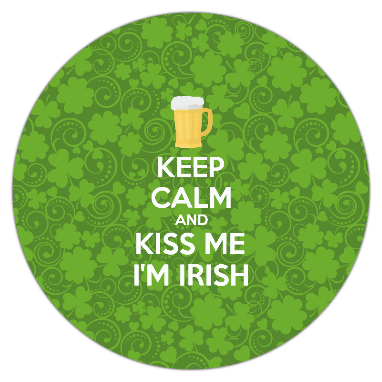 This lucky design is mostly bright green. The background has a lighter green and a darker green making up a background of clovers and swirls. The foreground is a fun phrase that says "Keep calm and kiss me I'm Irish." A fun beer graphic sits above this. You can easily personalize this phrase as well as the graphic above to be whatever you like.