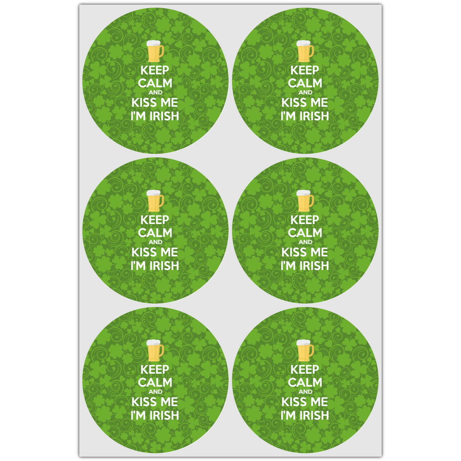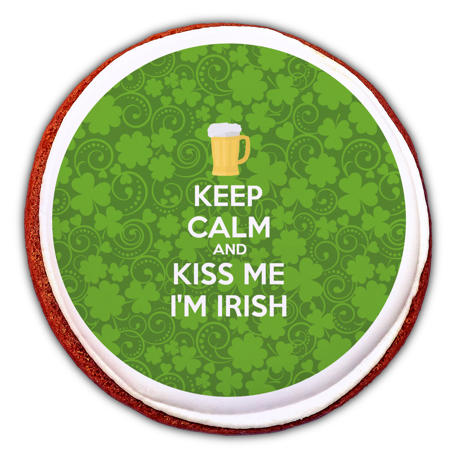 This lucky design is mostly bright green. The background has a lighter green and a darker green making up a background of clovers and swirls. The foreground is a fun phrase that says "Keep calm and kiss me I'm Irish." A fun beer graphic sits above this. You can easily personalize this phrase as well as the graphic above to be whatever you like.