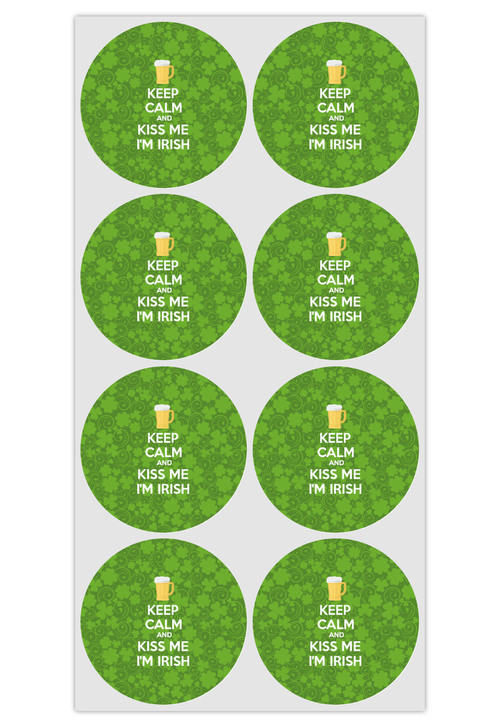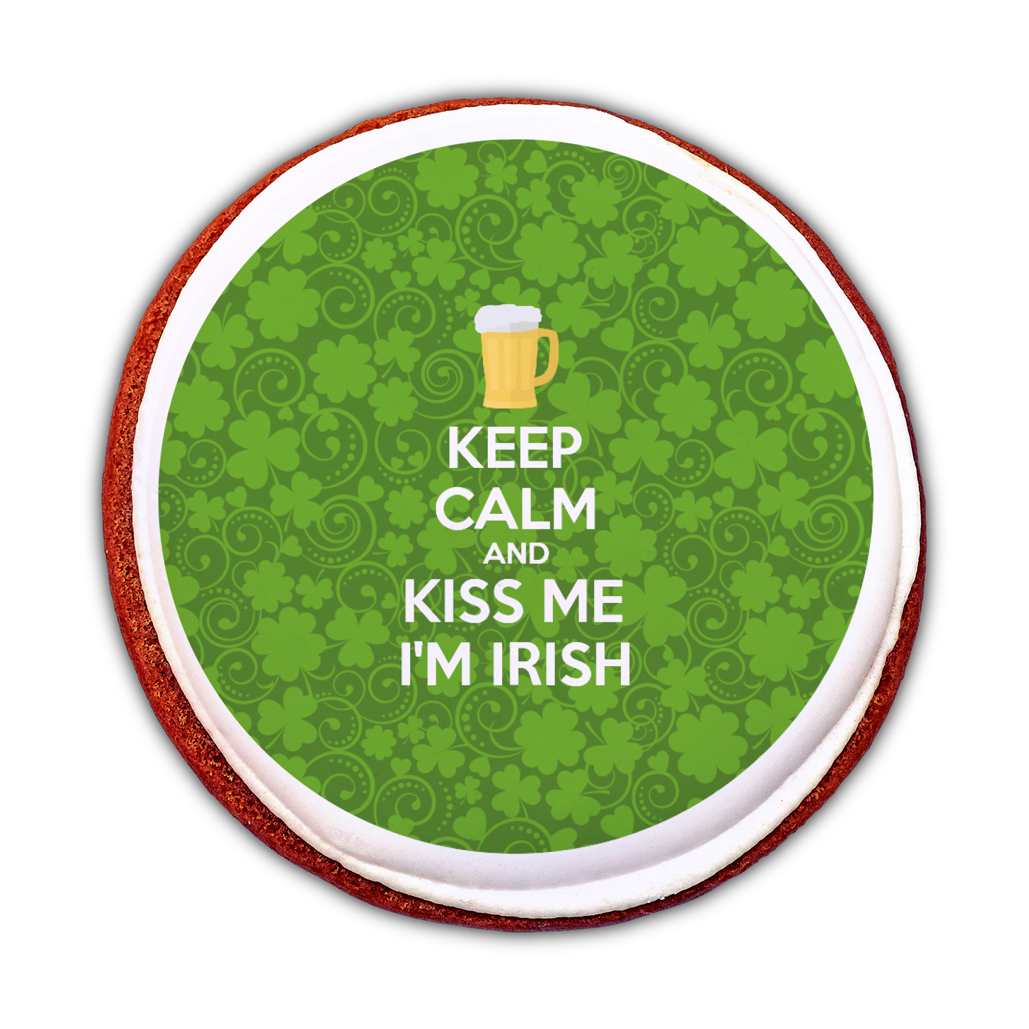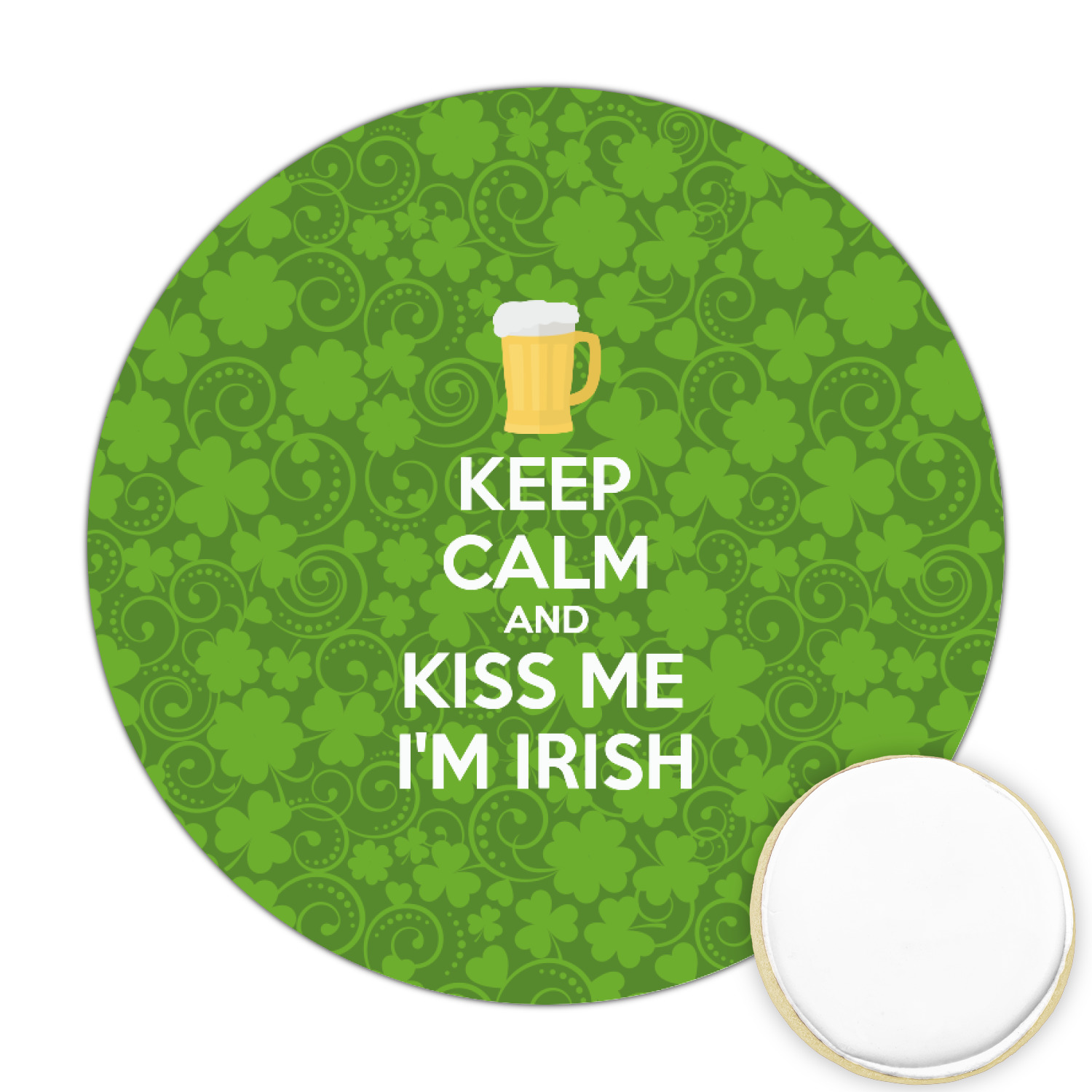 This lucky design is mostly bright green. The background has a lighter green and a darker green making up a background of clovers and swirls. The foreground is a fun phrase that says "Keep calm and kiss me I'm Irish." A fun beer graphic sits above this. You can easily personalize this phrase as well as the graphic above to be whatever you like.