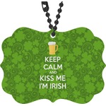 This lucky design is mostly bright green. The background has a lighter green and a darker green making up a background of clovers and swirls. The foreground is a fun phrase that says "Keep calm and kiss me I'm Irish." A fun beer graphic sits above this. You can easily personalize this phrase as well as the graphic above to be whatever you like.
