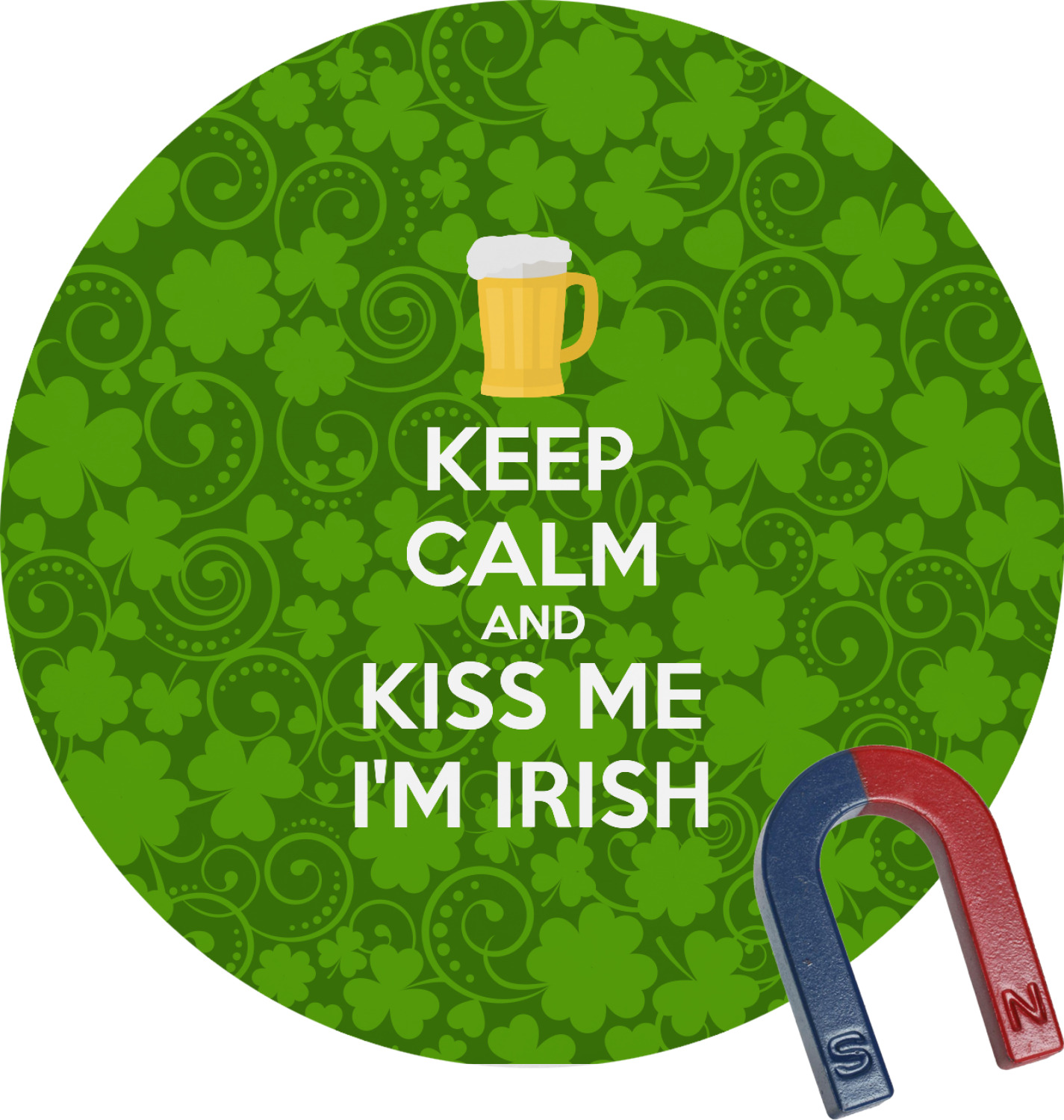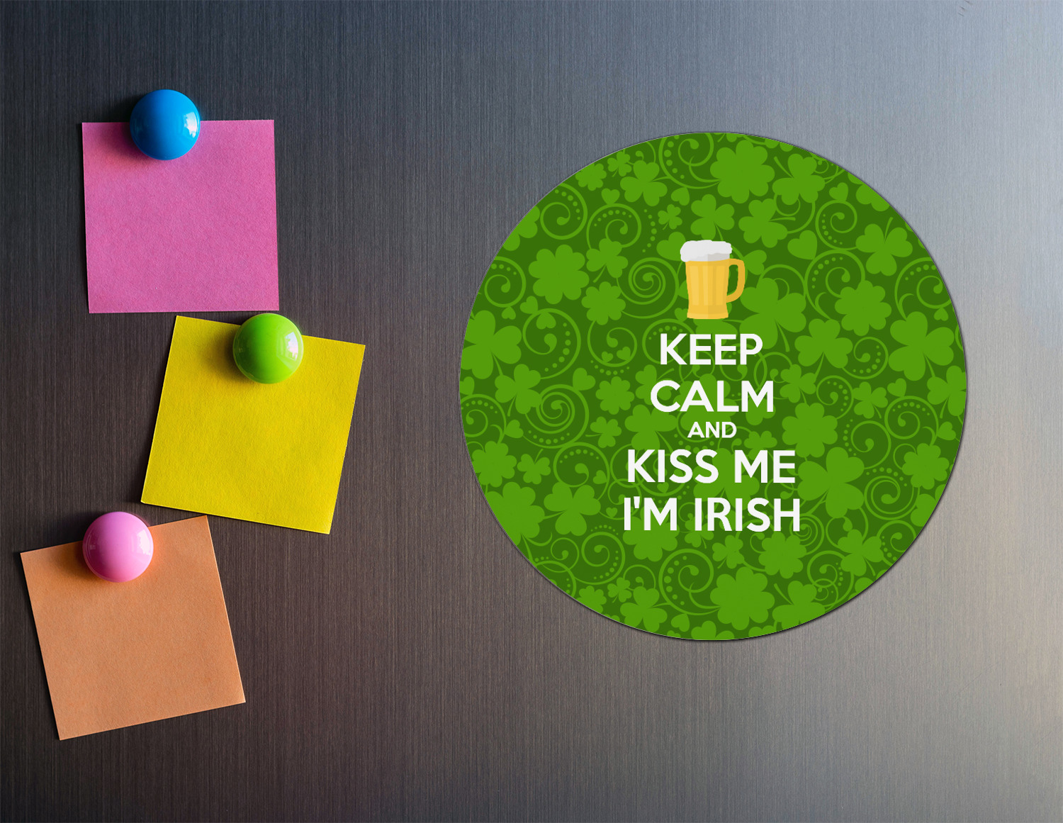 This lucky design is mostly bright green. The background has a lighter green and a darker green making up a background of clovers and swirls. The foreground is a fun phrase that says "Keep calm and kiss me I'm Irish." A fun beer graphic sits above this. You can easily personalize this phrase as well as the graphic above to be whatever you like.