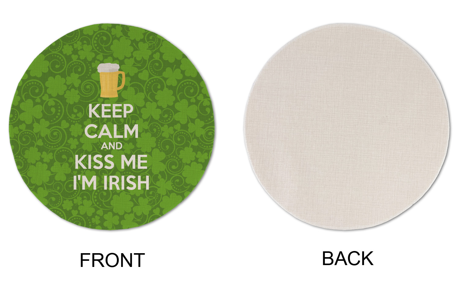 This lucky design is mostly bright green. The background has a lighter green and a darker green making up a background of clovers and swirls. The foreground is a fun phrase that says "Keep calm and kiss me I'm Irish." A fun beer graphic sits above this. You can easily personalize this phrase as well as the graphic above to be whatever you like.