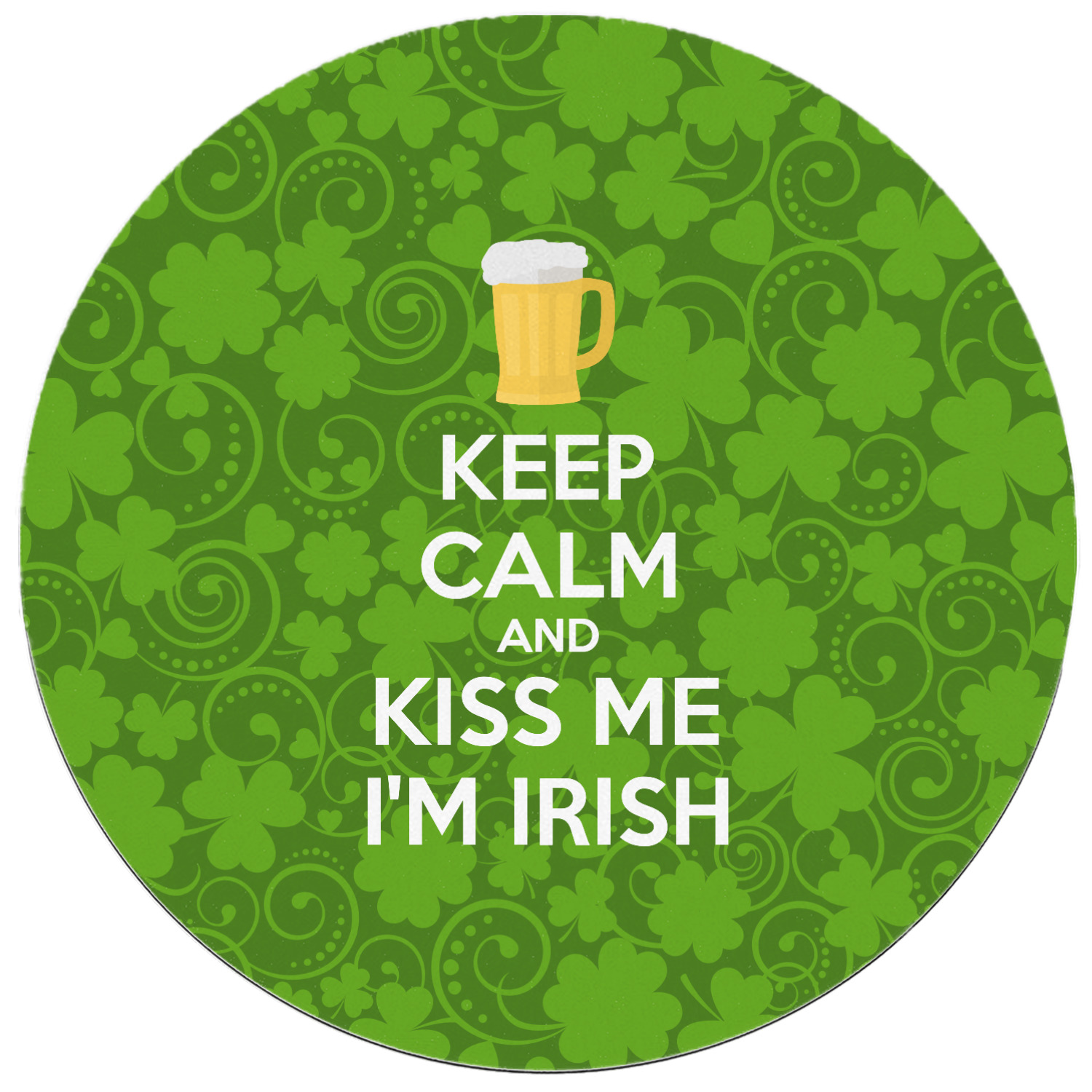 This lucky design is mostly bright green. The background has a lighter green and a darker green making up a background of clovers and swirls. The foreground is a fun phrase that says "Keep calm and kiss me I'm Irish." A fun beer graphic sits above this. You can easily personalize this phrase as well as the graphic above to be whatever you like.