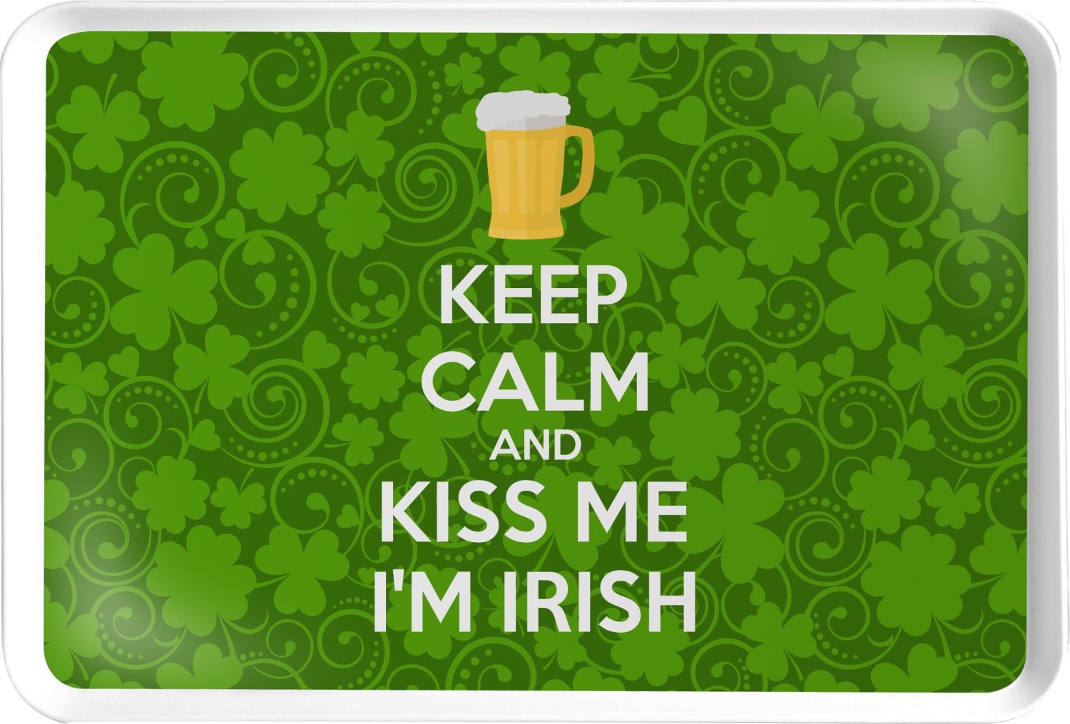This lucky design is mostly bright green. The background has a lighter green and a darker green making up a background of clovers and swirls. The foreground is a fun phrase that says "Keep calm and kiss me I'm Irish." A fun beer graphic sits above this. You can easily personalize this phrase as well as the graphic above to be whatever you like.