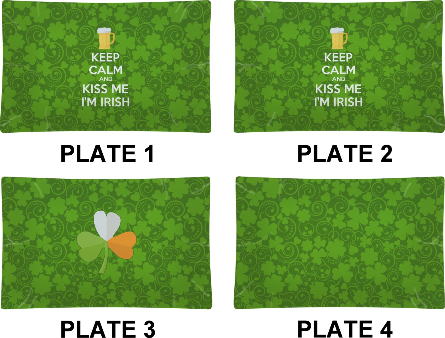 This lucky design is mostly bright green. The background has a lighter green and a darker green making up a background of clovers and swirls. The foreground is a fun phrase that says "Keep calm and kiss me I'm Irish." A fun beer graphic sits above this. You can easily personalize this phrase as well as the graphic above to be whatever you like.