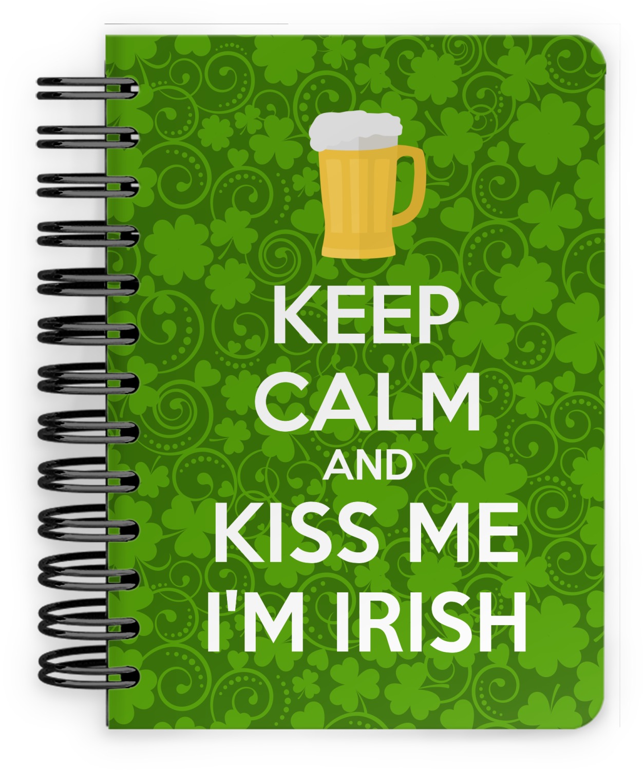 This lucky design is mostly bright green. The background has a lighter green and a darker green making up a background of clovers and swirls. The foreground is a fun phrase that says "Keep calm and kiss me I'm Irish." A fun beer graphic sits above this. You can easily personalize this phrase as well as the graphic above to be whatever you like.