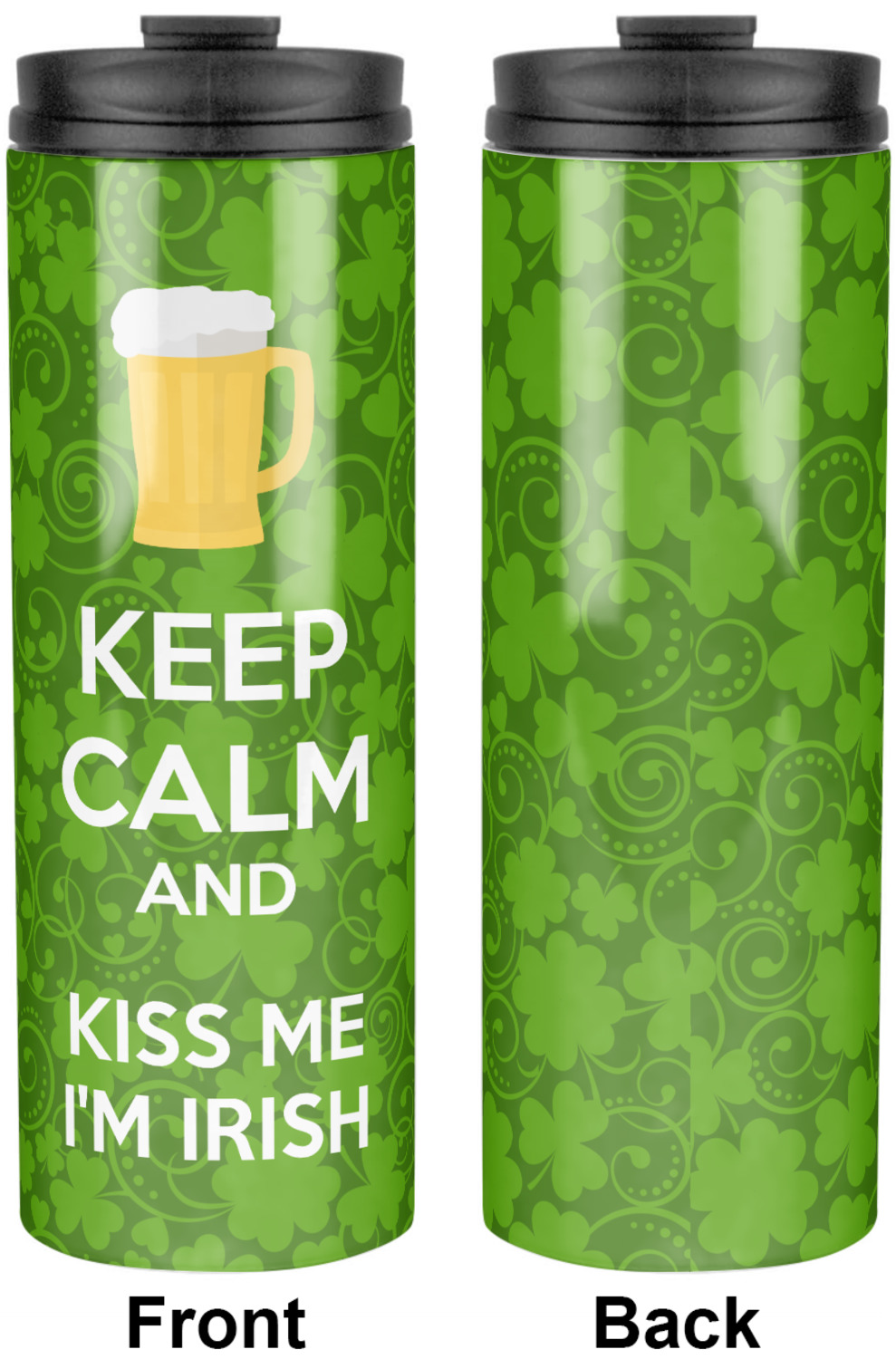 This lucky design is mostly bright green. The background has a lighter green and a darker green making up a background of clovers and swirls. The foreground is a fun phrase that says "Keep calm and kiss me I'm Irish." A fun beer graphic sits above this. You can easily personalize this phrase as well as the graphic above to be whatever you like.