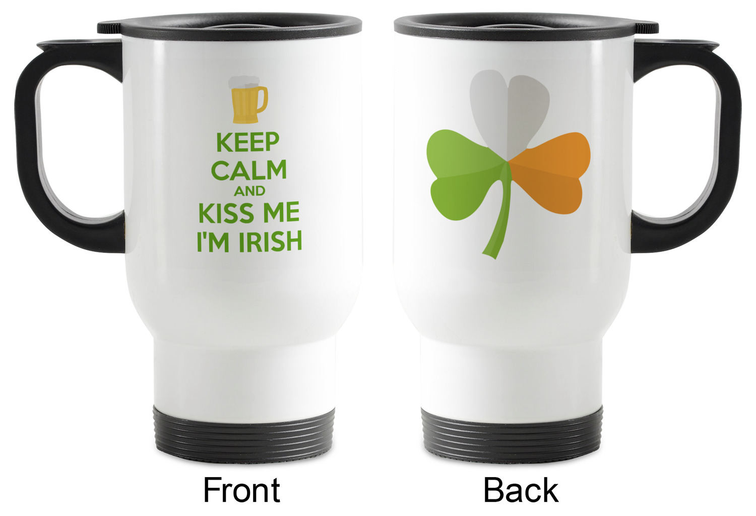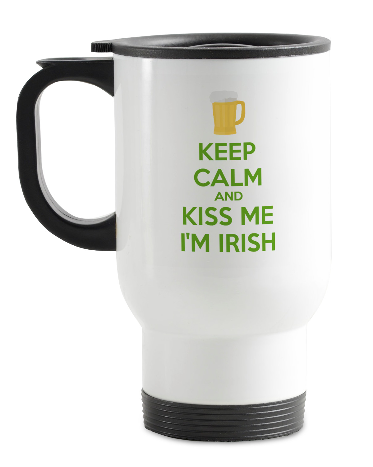 This lucky design is mostly bright green. The background has a lighter green and a darker green making up a background of clovers and swirls. The foreground is a fun phrase that says "Keep calm and kiss me I'm Irish." A fun beer graphic sits above this. You can easily personalize this phrase as well as the graphic above to be whatever you like.
