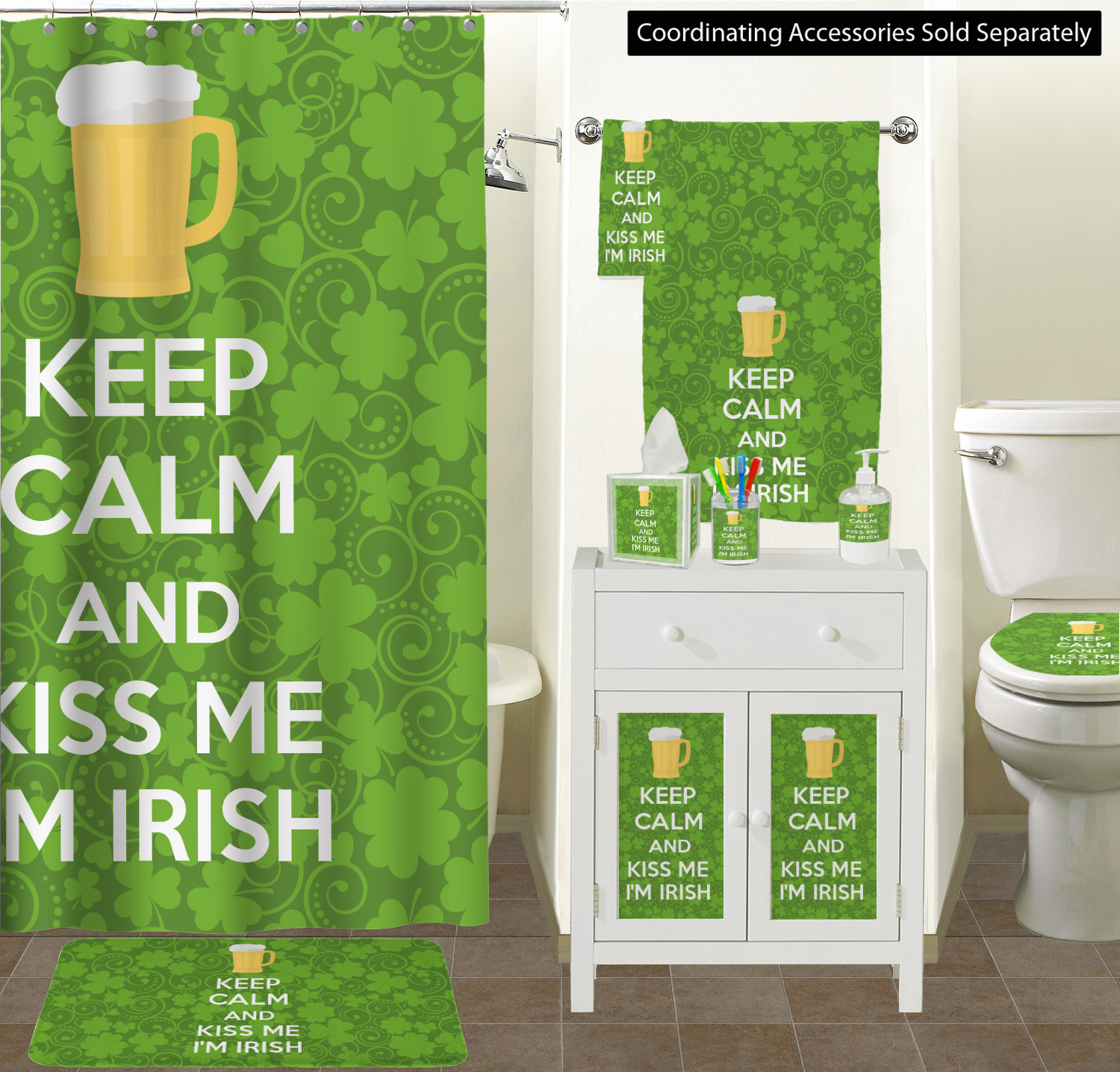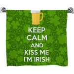 This lucky design is mostly bright green. The background has a lighter green and a darker green making up a background of clovers and swirls. The foreground is a fun phrase that says "Keep calm and kiss me I'm Irish." A fun beer graphic sits above this. You can easily personalize this phrase as well as the graphic above to be whatever you like.