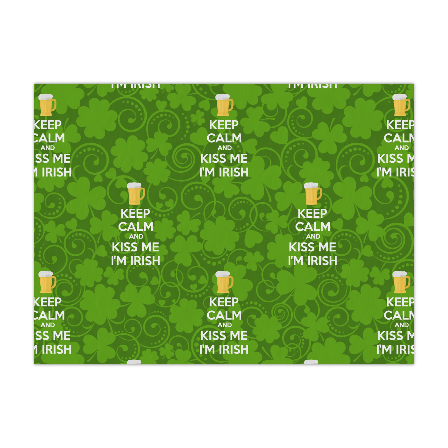 This lucky design is mostly bright green. The background has a lighter green and a darker green making up a background of clovers and swirls. The foreground is a fun phrase that says "Keep calm and kiss me I'm Irish." A fun beer graphic sits above this. You can easily personalize this phrase as well as the graphic above to be whatever you like.