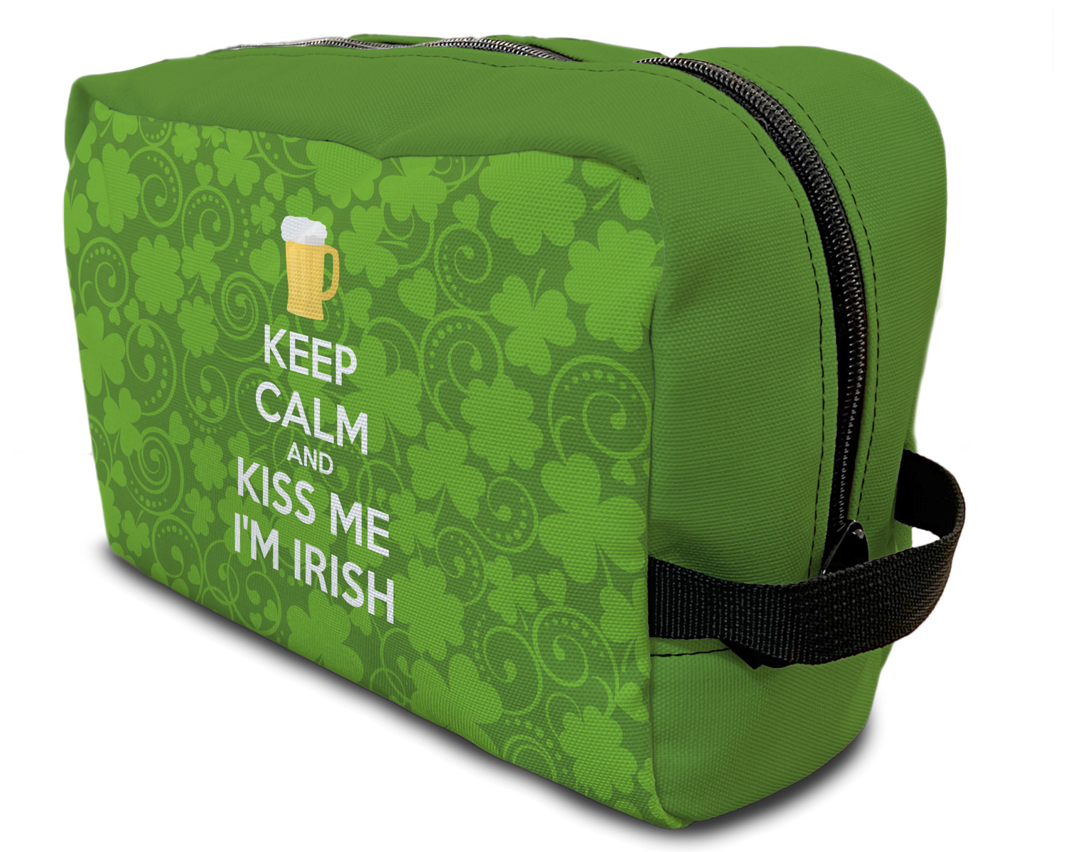 This lucky design is mostly bright green. The background has a lighter green and a darker green making up a background of clovers and swirls. The foreground is a fun phrase that says "Keep calm and kiss me I'm Irish." A fun beer graphic sits above this. You can easily personalize this phrase as well as the graphic above to be whatever you like.