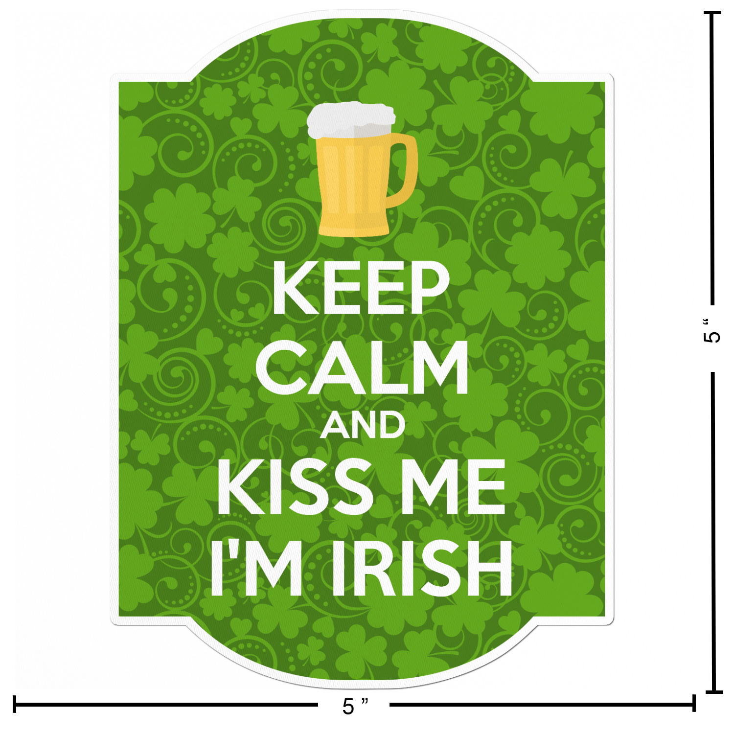 This lucky design is mostly bright green. The background has a lighter green and a darker green making up a background of clovers and swirls. The foreground is a fun phrase that says "Keep calm and kiss me I'm Irish." A fun beer graphic sits above this. You can easily personalize this phrase as well as the graphic above to be whatever you like.