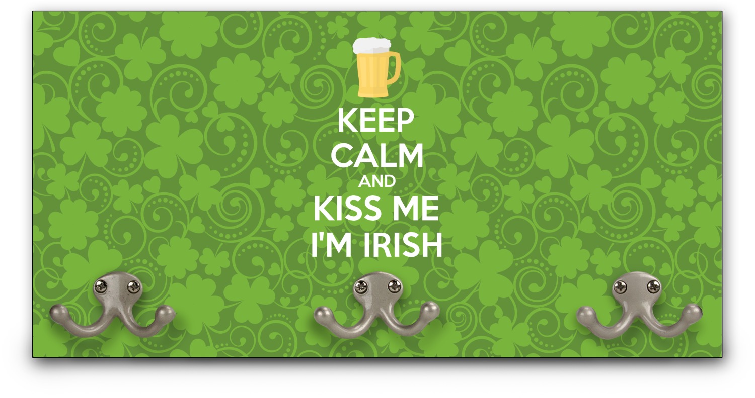 This lucky design is mostly bright green. The background has a lighter green and a darker green making up a background of clovers and swirls. The foreground is a fun phrase that says "Keep calm and kiss me I'm Irish." A fun beer graphic sits above this. You can easily personalize this phrase as well as the graphic above to be whatever you like.