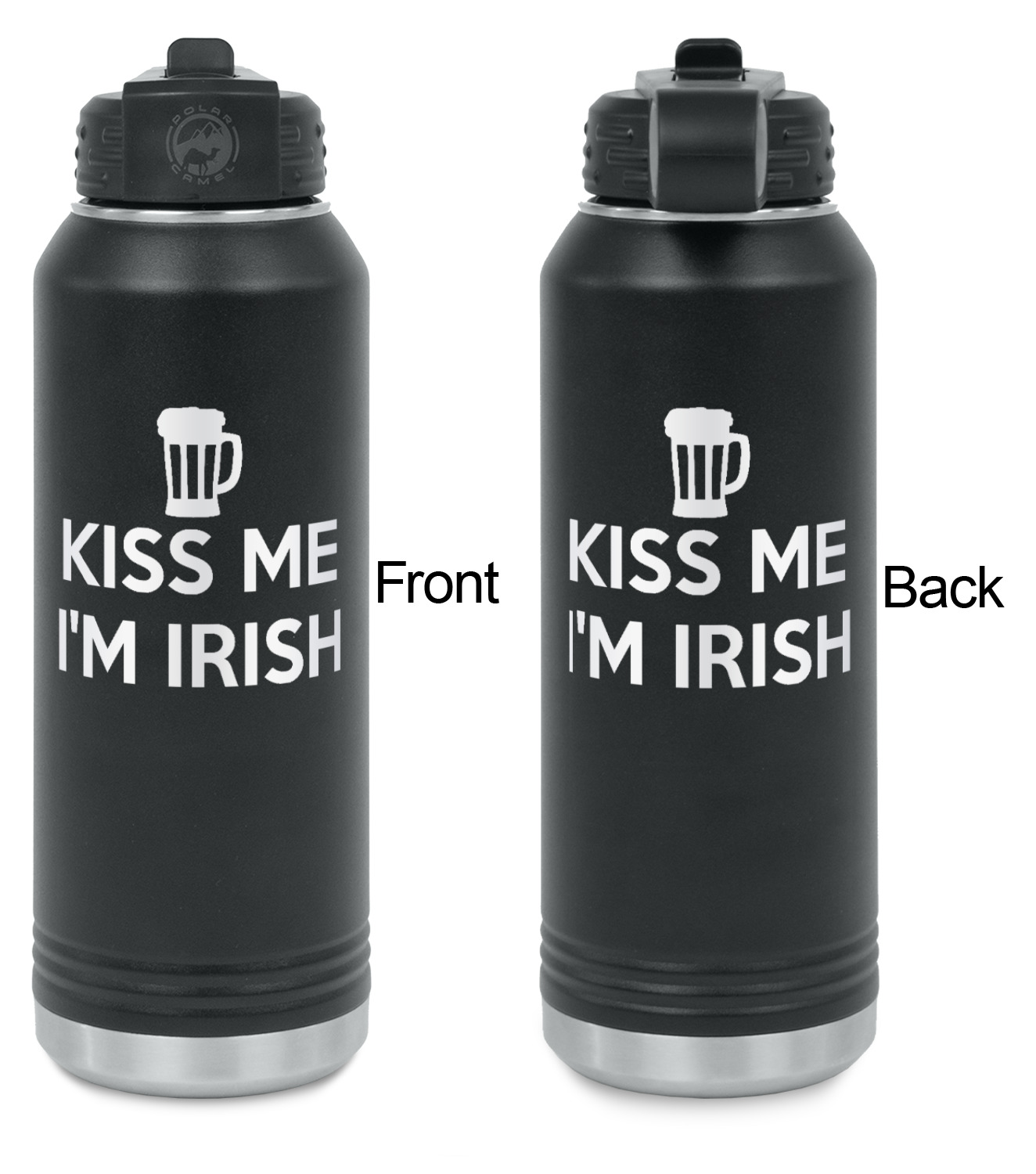 These 32 oz. water bottles are constructed from 18/8 durable food grade stainless steel. The inside of the water bottle is silver; while the outside is powder coated black