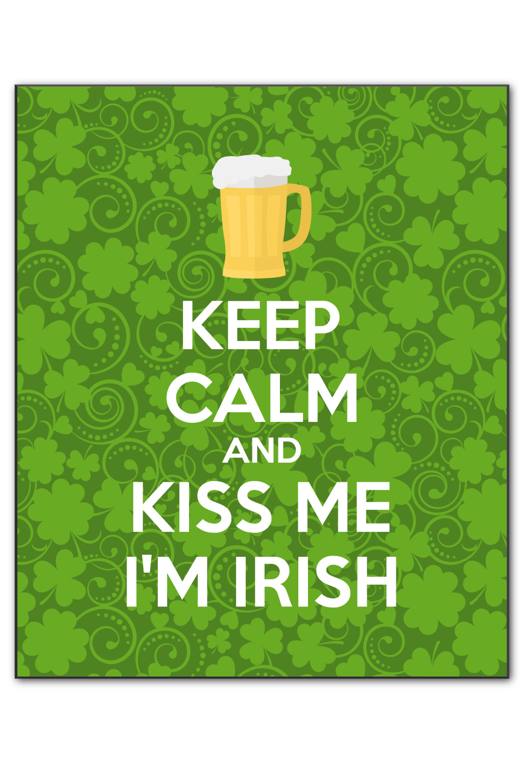 This lucky design is mostly bright green. The background has a lighter green and a darker green making up a background of clovers and swirls. The foreground is a fun phrase that says "Keep calm and kiss me I'm Irish." A fun beer graphic sits above this. You can easily personalize this phrase as well as the graphic above to be whatever you like.