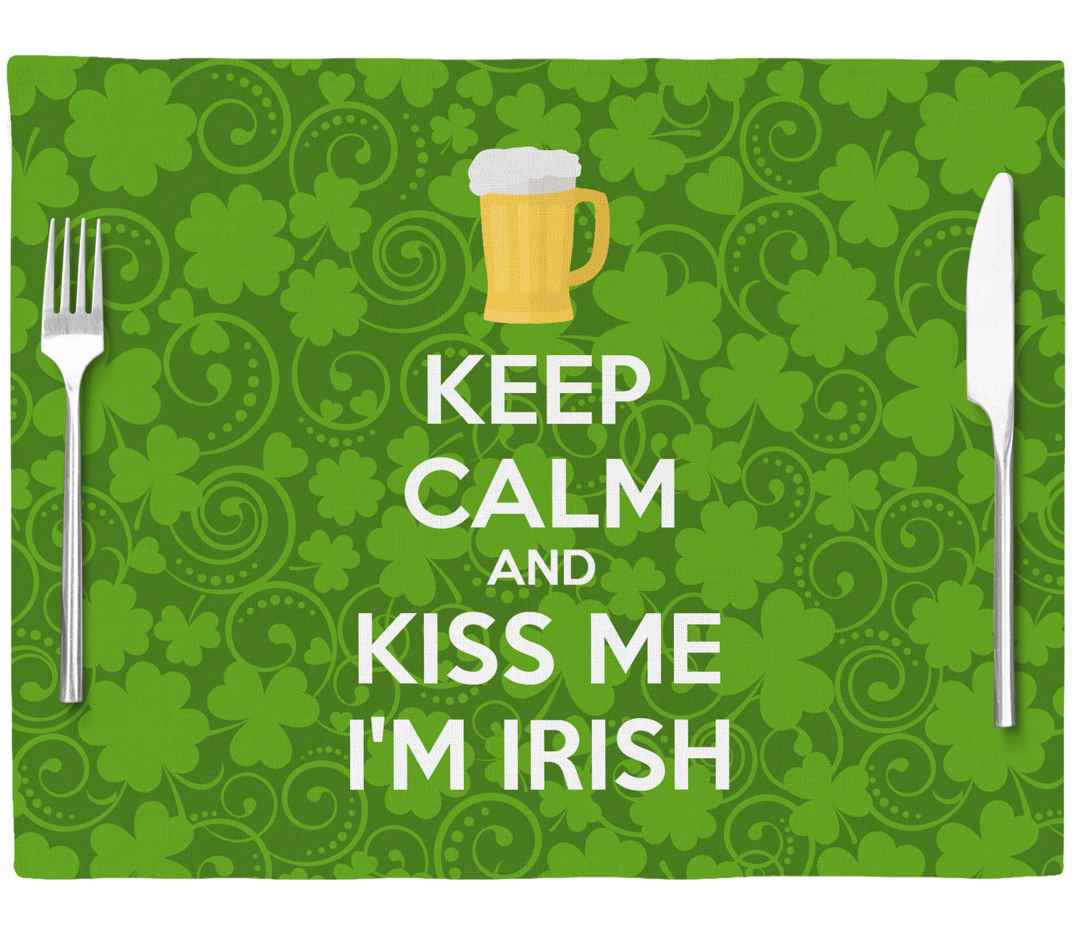 This lucky design is mostly bright green. The background has a lighter green and a darker green making up a background of clovers and swirls. The foreground is a fun phrase that says "Keep calm and kiss me I'm Irish." A fun beer graphic sits above this. You can easily personalize this phrase as well as the graphic above to be whatever you like.