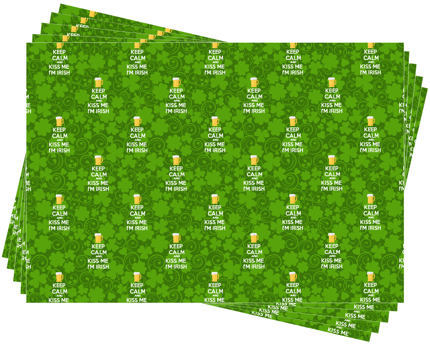 This lucky design is mostly bright green. The background has a lighter green and a darker green making up a background of clovers and swirls. The foreground is a fun phrase that says "Keep calm and kiss me I'm Irish." A fun beer graphic sits above this. You can easily personalize this phrase as well as the graphic above to be whatever you like.