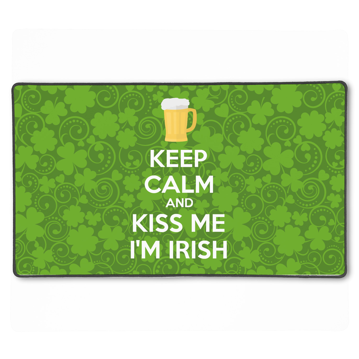 This lucky design is mostly bright green. The background has a lighter green and a darker green making up a background of clovers and swirls. The foreground is a fun phrase that says "Keep calm and kiss me I'm Irish." A fun beer graphic sits above this. You can easily personalize this phrase as well as the graphic above to be whatever you like.