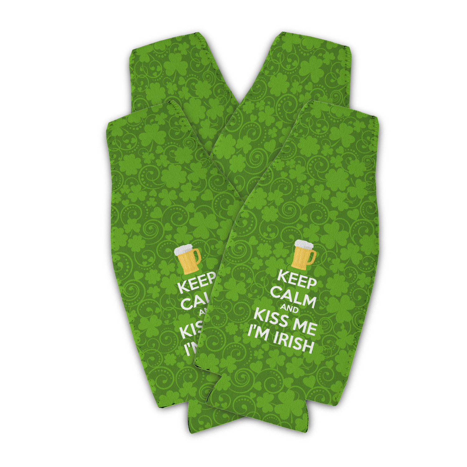 This lucky design is mostly bright green. The background has a lighter green and a darker green making up a background of clovers and swirls. The foreground is a fun phrase that says "Keep calm and kiss me I'm Irish." A fun beer graphic sits above this. You can easily personalize this phrase as well as the graphic above to be whatever you like.