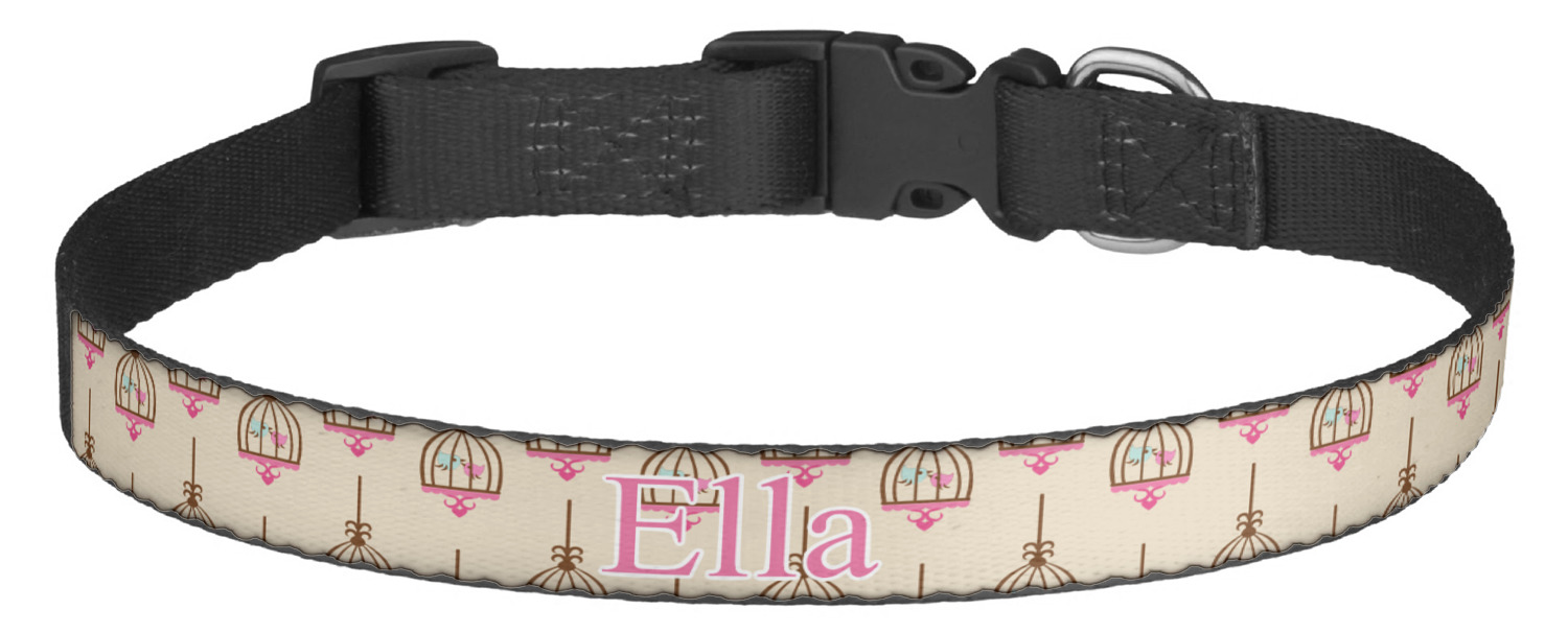This sturdy collar, made from a durable nylon weave, will outlive your dog's episodes of excited tugging and pulling. Courtesy of its thick plastic buckle and adjuster, this collar is adjustable and accommodating of any dog. Structurally, the collar is a single piece of nylon weave that is sewn together, and features a solid metal loop where you can attach a leash or dog tag. We print and display your dog's name and pattern across the middle of the personalized dog collar.
