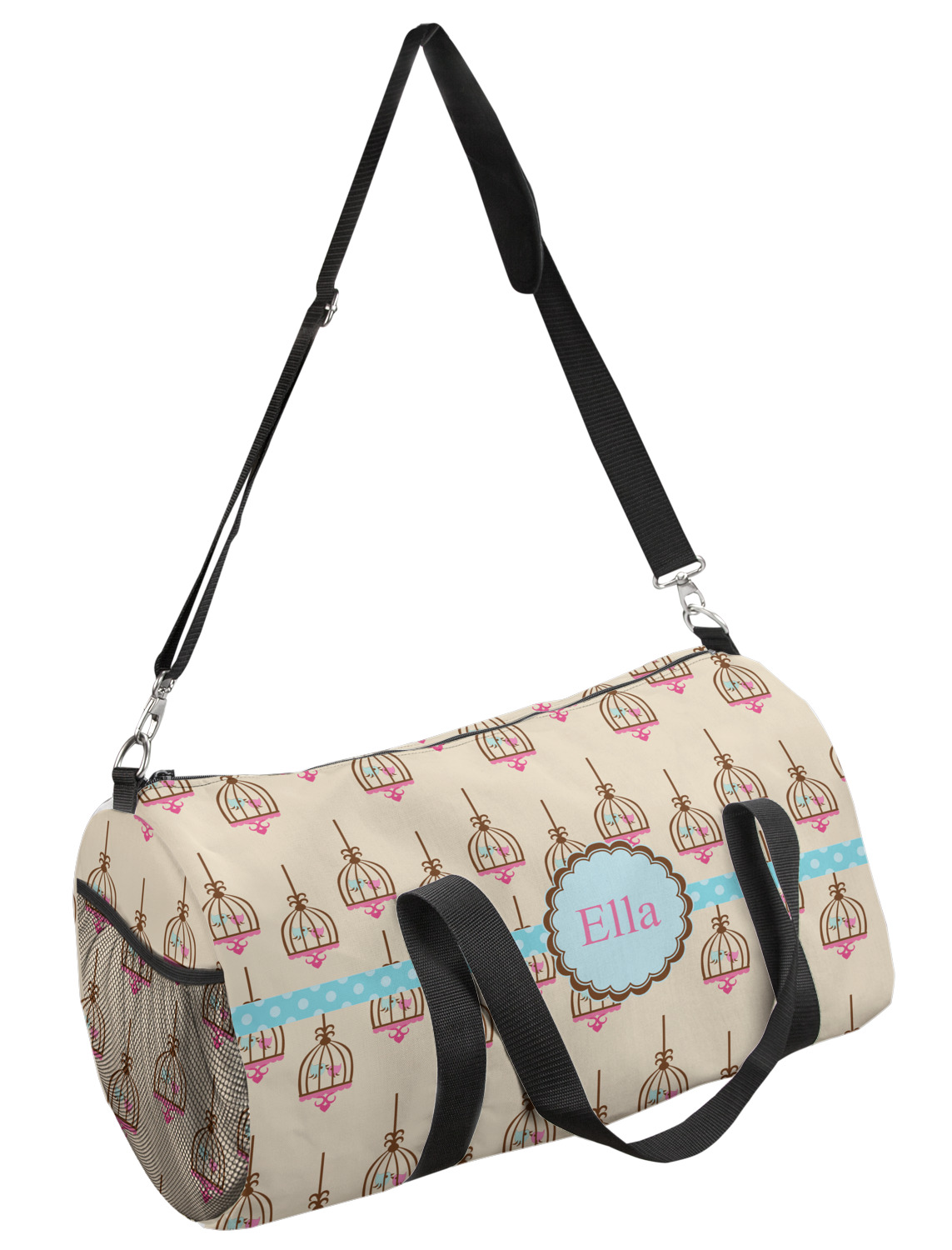 This duffle is a sturdy bag made of a canvas material. It comes in two sizes: Small (19"W x 9.5"H x 9.5"D) and Large (23"W x 12"H x 12"D). The bag is a cylindrical shape with a black adjustable strap and two handles. On one side is an elastic pouch to put a waterbottle or other small item. Your product will be sublimated with your design and is able to be designed on the front, back, and sides. Be sure to remember that the straps may cut into parts of your design if you upload your own artwork.