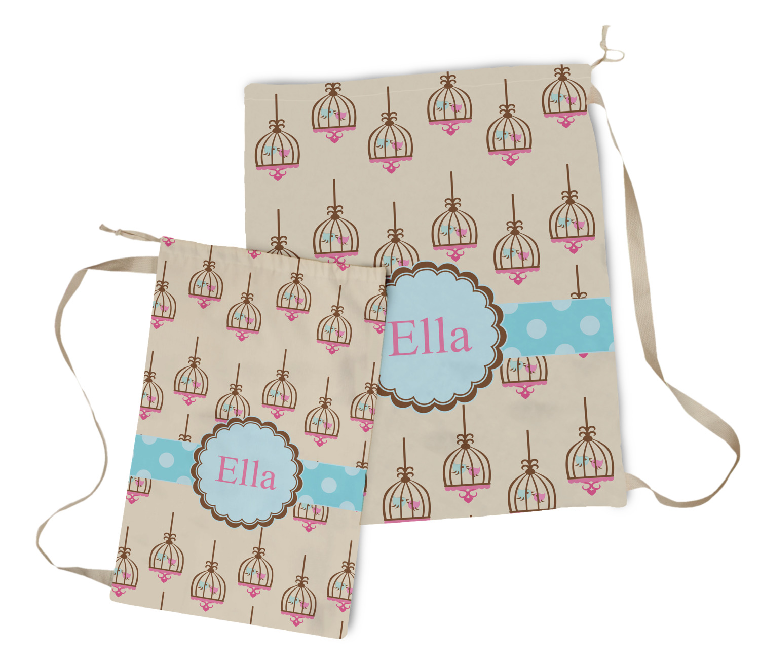 Carry your laundry in style with these customized laundry bags. Available in two sizes, featuring a natural colored woven strap and a cinch cord, these bags hold a lot of clothes or anything else you want to fit in them.