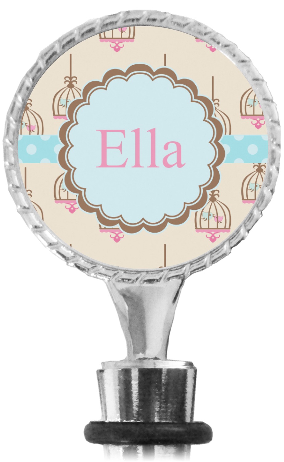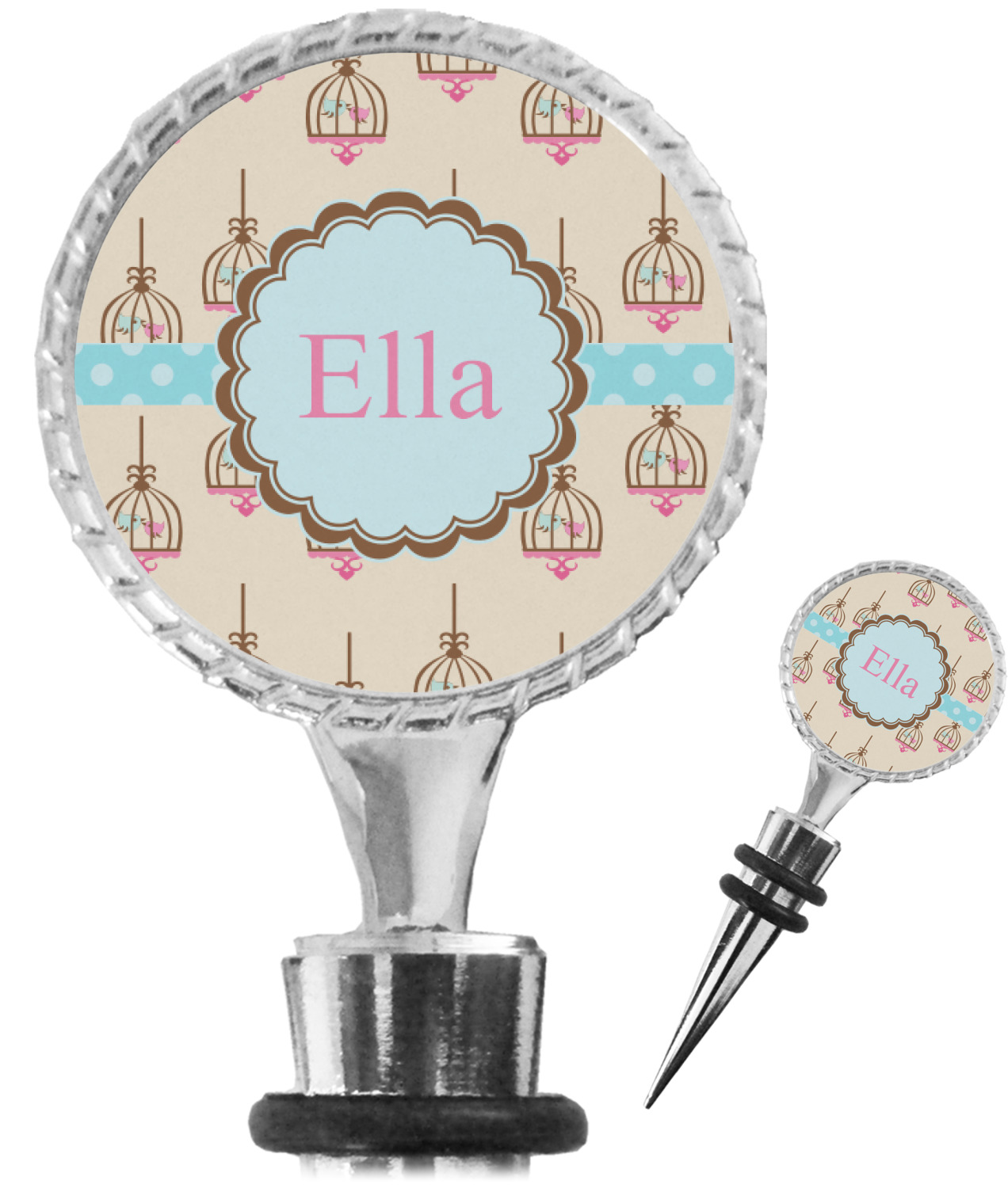 The top part of your bottle stopper is comprised of a zinc ring that displays your customization(s) in its middle, on both sides. The ring is heavy duty, with a bright chrome finish. The body of the wine stoppers have two silicone rings to provide an airtight seal. These wine bottle stoppers measure at 1.625" L x 0.8125" W x 4.625" H; your custom wine stopper is meant to fit into most standard-sized wine bottles.