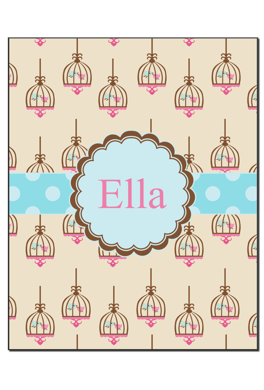 A band of light blue polka dots spans across the design and a blue scalloped label with brown trim houses the personalization of your choice.