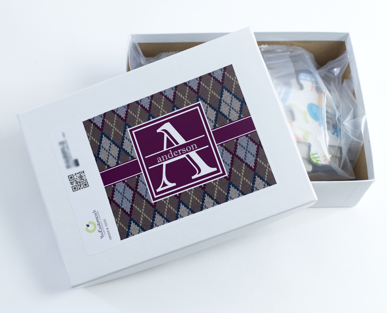 Add a cozy touch of a knit sweater to anything with our Knit Argyle design. The primary color of the design is gray with stitches of dark violet, dark blue, and cream. The design also includes a ribbon and label shown in dark violet.