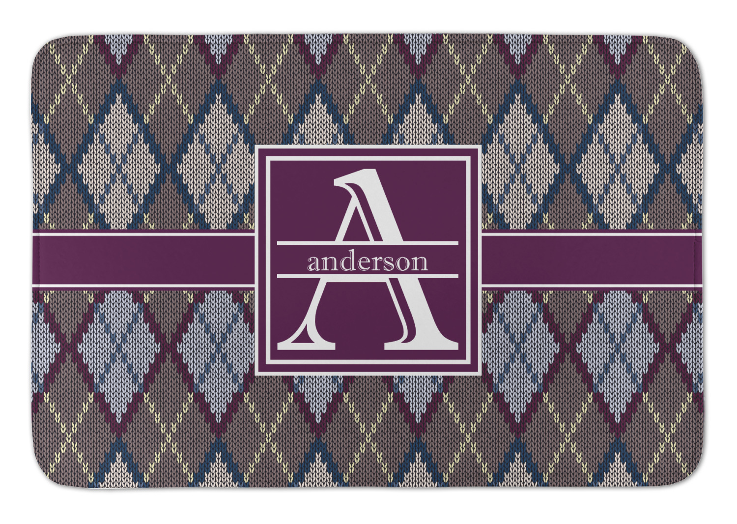 Add a cozy touch of a knit sweater to anything with our Knit Argyle design. The primary color of the design is gray with stitches of dark violet, dark blue, and cream. The design also includes a ribbon and label shown in dark violet.