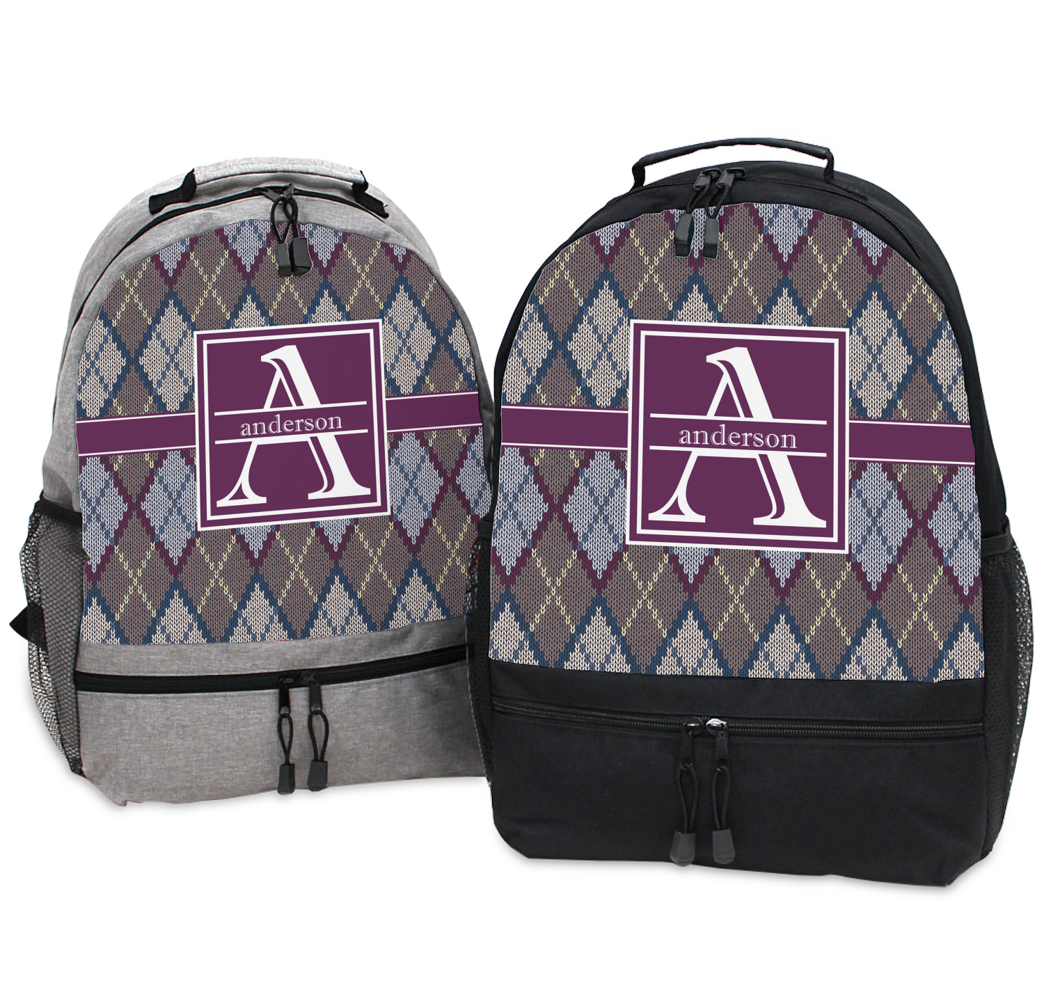 Add a cozy touch of a knit sweater to anything with our Knit Argyle design. The primary color of the design is gray with stitches of dark violet, dark blue, and cream. The design also includes a ribbon and label shown in dark violet.