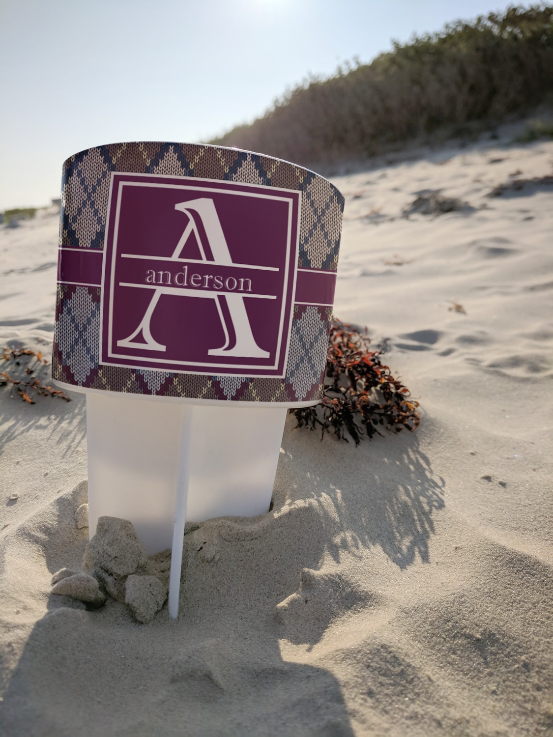 This cup holder has a large stake at its bottom that anchors it to the sand or ground below, while the cup holder rests above the stake. The entire drink holder is made of durable plastic and displays your customization around the cup holder portion. We sell these personalized beach spikers in two different colors: black and white.