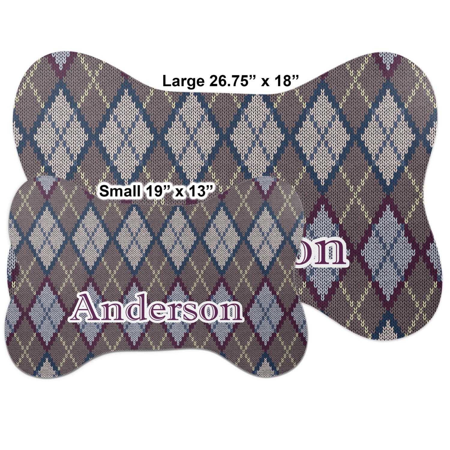 The top of this mat displays your custom design, as it is printed on polyester. To prevent slippage, the underside of the mat is made of rubber. We offer a small dog food mat, suitable for smaller dogs and a large dog food mat for bigger breeds. The small dog food mat is approximately 19 by 13 inches, while the large dog feeding mat measures at approximately 26.75 by 18 inches. Both personalized mats are ideally sized to fit two dog bowls.