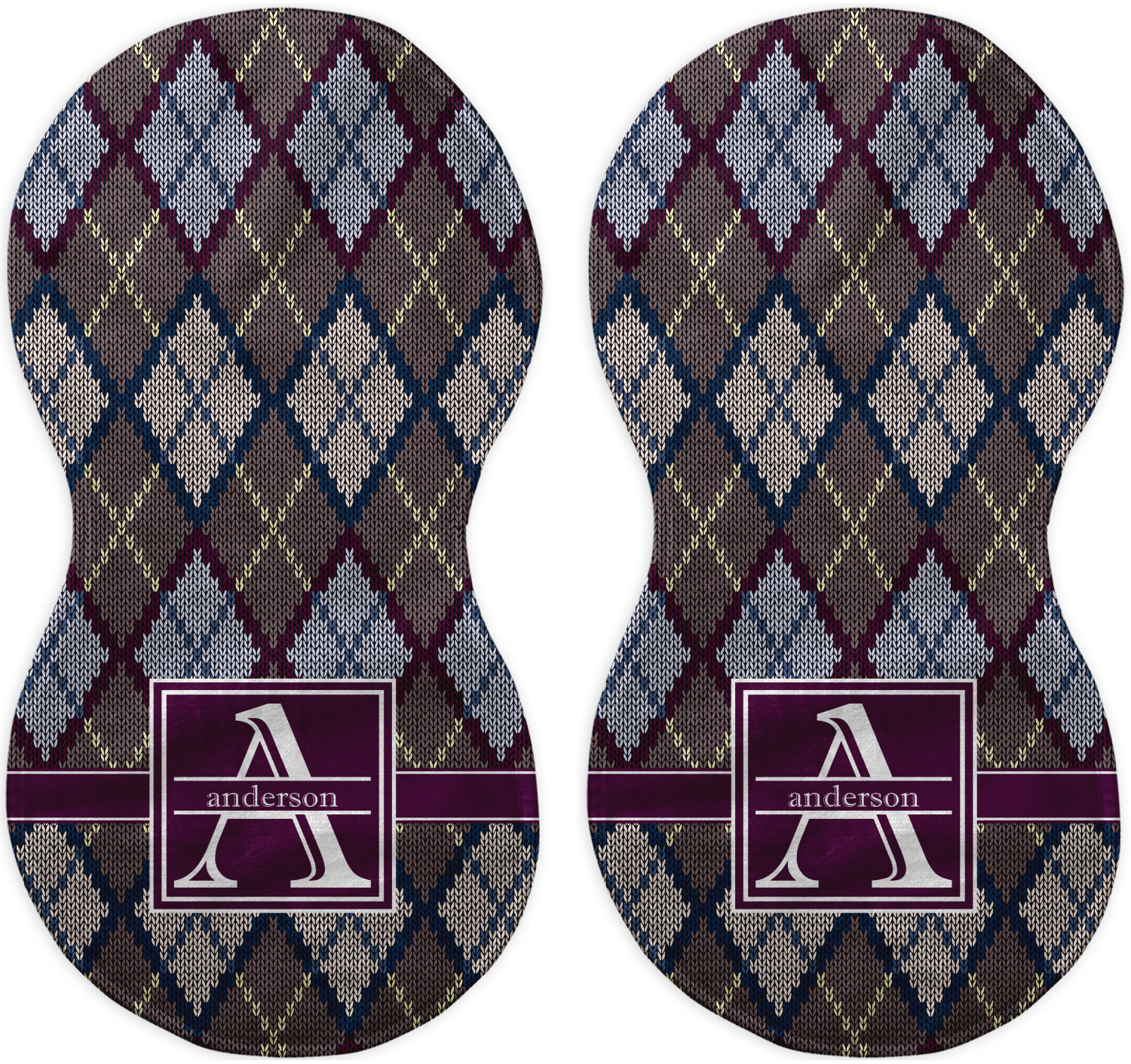 Add a cozy touch of a knit sweater to anything with our Knit Argyle design. The primary color of the design is gray with stitches of dark violet, dark blue, and cream. The design also includes a ribbon and label shown in dark violet.